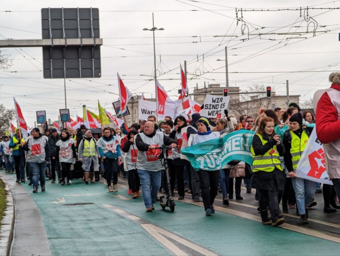 Dieser ist heute ebenfalls vor Ort, nach seiner Schätzung nehmen etwa 1.500 Menschen am Aufzug in der Innenstadt teil. Nicht zu vergessen die Personen an den Streikposten außerhalb der City, wo der Ausstand der Mitarbeiter des öffentlichen Dienstes offiziell um drei Uhr früh begann (mehr dazu im ersten Teil des Livetickers).