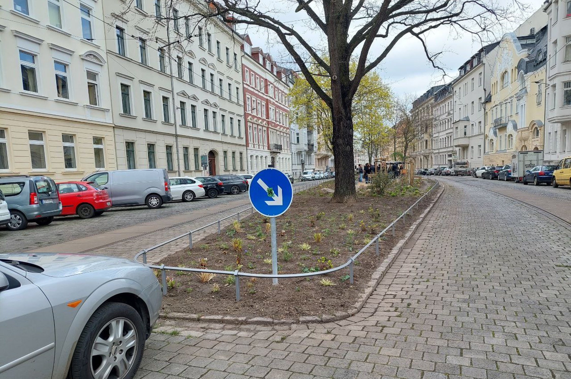 Auf der inneren Straßenseite hin zum Gohliser Anger soll Parken gänzlich untersagt sein. Dadurch soll die Querung für Jung und Alt gefahrlos möglich sein und zugleich klimafreundliche Mobilitätsformen unterstützt werden. Nach außen folgen dann Stellflächen für Car-Sharing, Parkplätze mit e-Ladestationen und Kurzzeit-Parkplätze für Anwohner-Lieferverkehr. Damit wird der Straßenraum auf der Länge des Angers für PKW-Dauerparker obsolet. Diese Parkflächen werden aber nicht „weggenommen“, sondern in Parkflächen klimafreundlicher Mobilitätsformen umgewandelt.