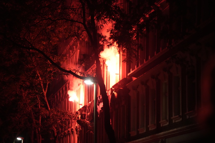 Als Reaktion auf die Räumung des besetzten „Helium“ in der Hermann-Liebmann-Straße 108 am Montag, war zum „massenhaften Cornern“ rund um den Torgauer Platz an der Eisenbahnstraße aufgerufen worden. Gegen 20 Uhr waren ungefähr 400 Menschen vor Ort und es entwickelte sich eine Spontandemonstration in die Ludwigstraße. Dort drangen Menschen in das Gebäude Nummer 96 ein und zündeten die Bengalos.