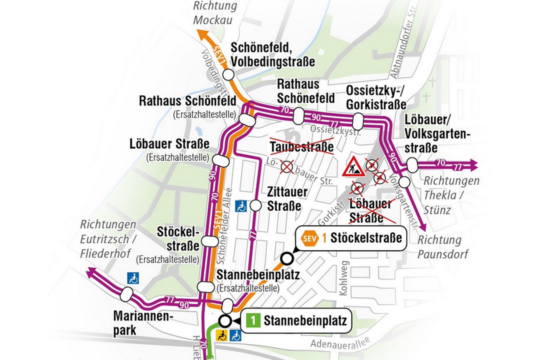 Die Straßenbahnlinie 1 verkehrt bis Ende November 2024 verkürzt zur Ersatzendstelle Stannebeinplatz. Schienenersatzverkehr ist zwischen Stöckelstraße und Thekla über Stannebeinplatz und Mockau, Post im Einsatz. Die Buslinien 70 und 90 verkehren ab dem 26. Februar bis August zwischen Stannebeinplatz und Löbauer/Volksgartenstraße mit Umleitung über die Schönefelder Allee und Ossietzkystraße.