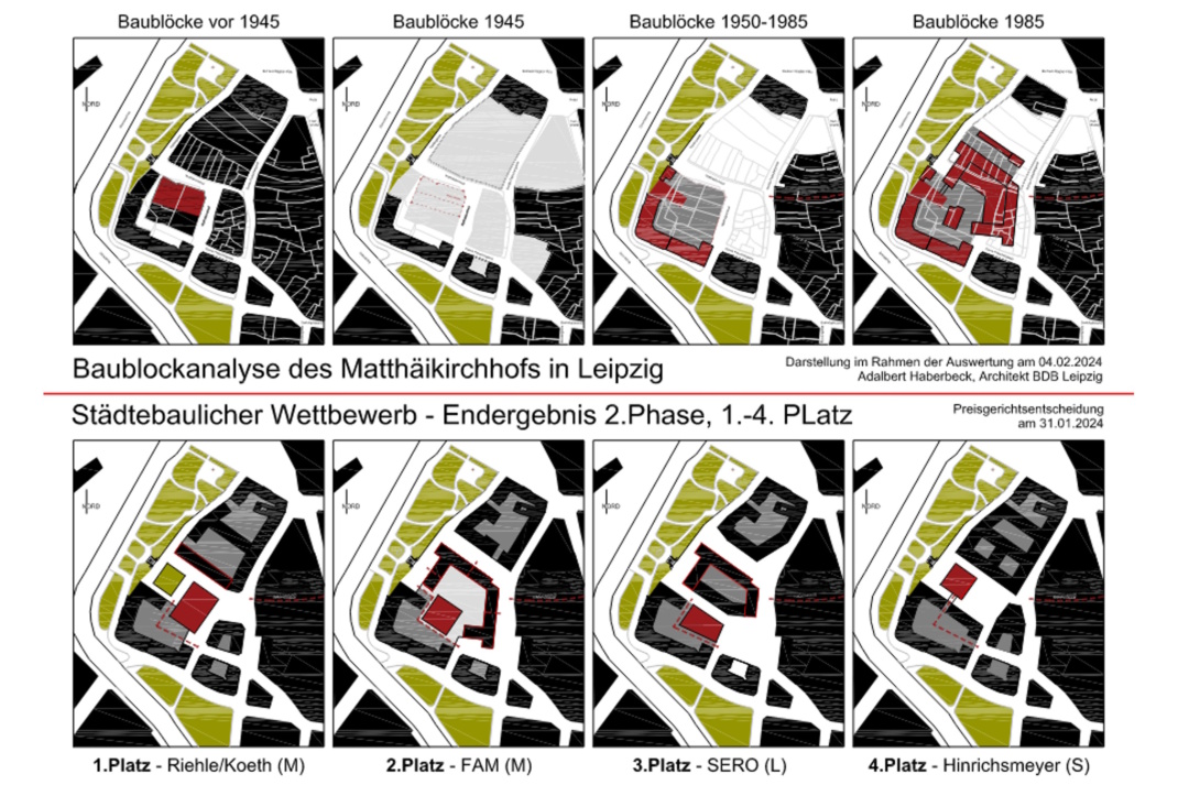 Um sichtbar zu machen, inwieweit die vier mit Preisen ausgezeichneten Arbeiten die städtebaulichen Strukturen aufnehmen, hat er sie den historischen Blockstrukturen zeichnerisch gegenüber gestellt. So wird auch sichtbar, wie sich der Stadtraum verändert, wenn einer der Preisträgerentwürfe umgesetzt wird.