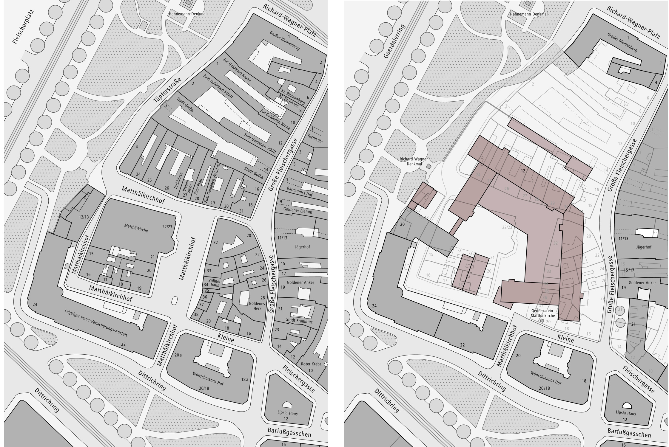Zudem wird mit der Kleinteiligkeit die Maßstäblichkeit der Vorgründerzeit aufgenommen und der Maßstabssprung gekonnt am Platzrand des neuen Matthäi-Platzes vollzogen. Ebenso gekonnt soll im Norden das Quartier zu ,,Wünschmanns Hof‘‘ unter Beachtung der mittleren U-förmigen Gebäudeabschlüsse nunmehr in der Maßstäblichkeit der Gründerzeit als homogener Block wiederhergestellt werden.