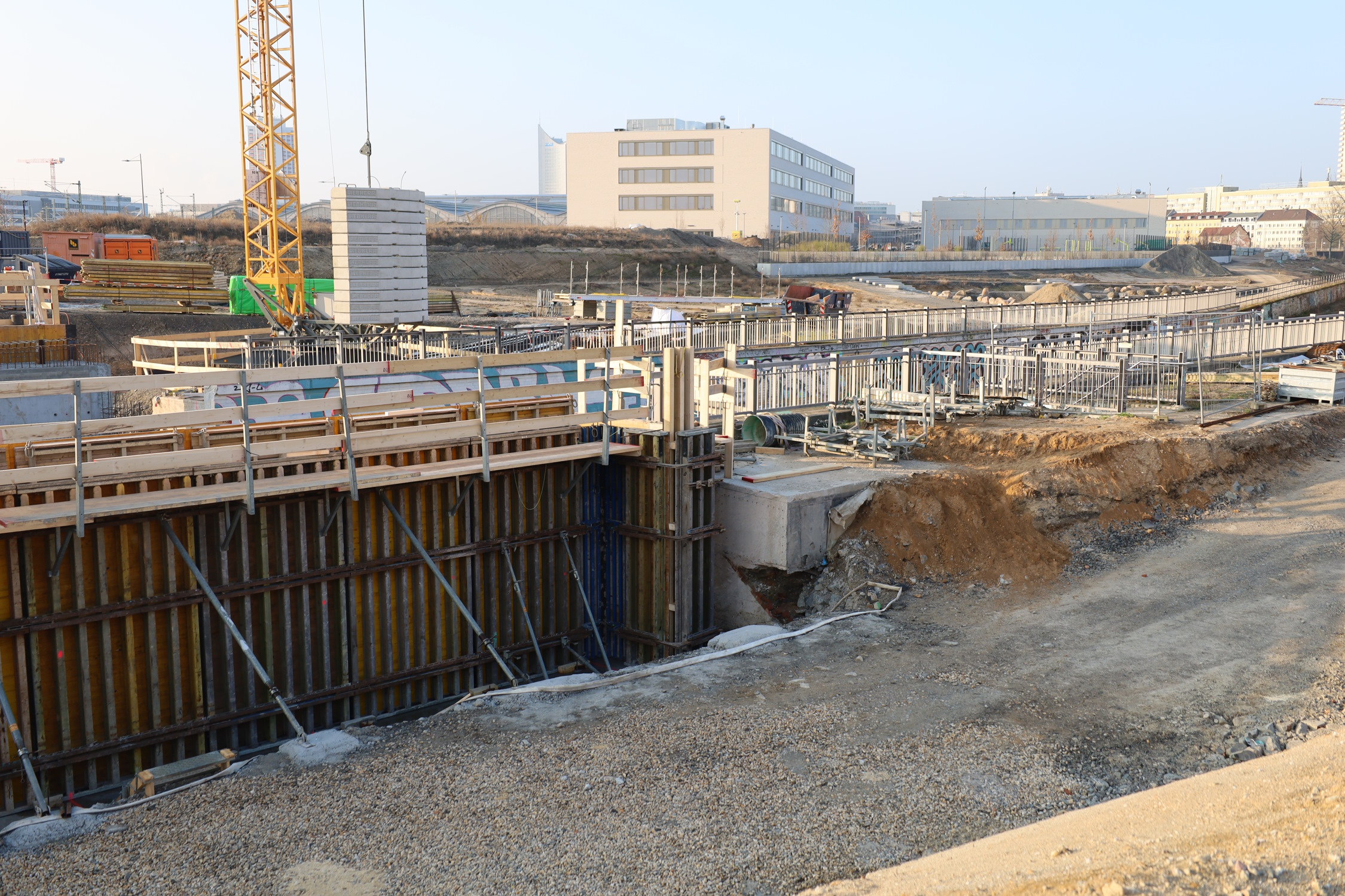 Die Kinder, die künftig im neuen Gymnasium Hauptbahnhof-Westseite zur Schule gehen, werden lange Wege haben. Denn das Gymnasium eröffnet zum Schuljahresbeginn 2024/2025 mitten in einer großen Baustelle. Und heute existieren noch keine sicheren Zuwegungen. Eine soll sogar erst in der zweiten Jahreshälfte gebaut werden. Es könnte sich aber auch noch verzögern, wenn die neue Brücke über die Parthe Richtung Berliner Straße nicht rechtzeitig fertig wird.
