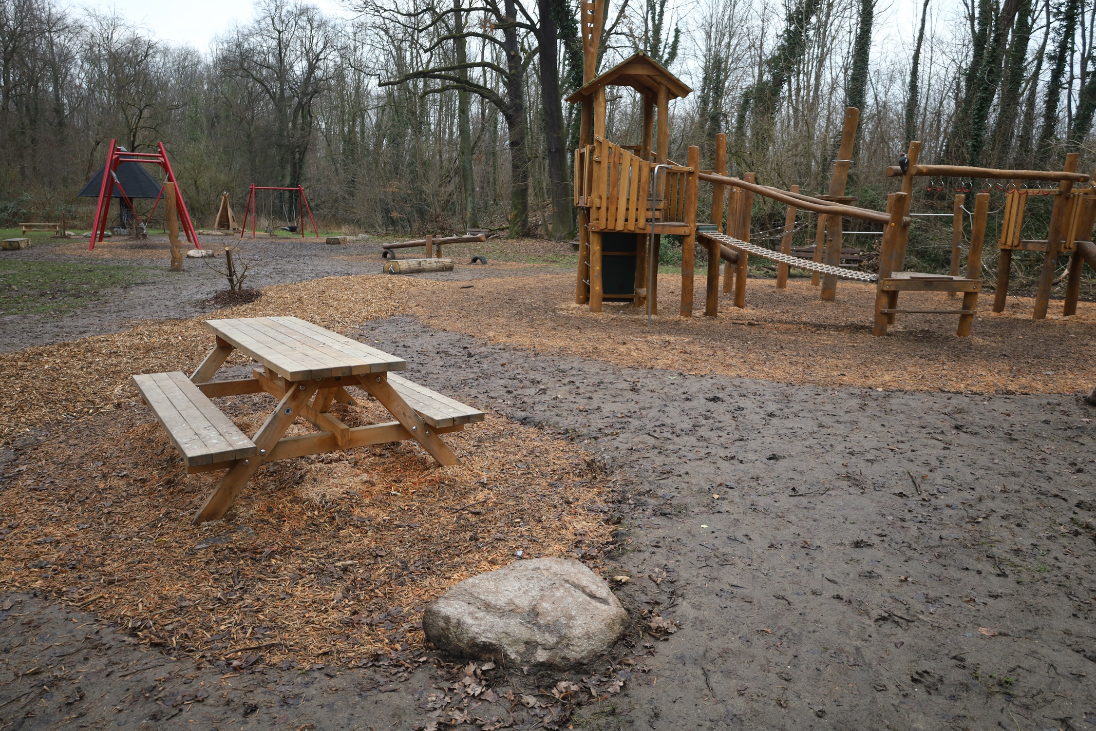Ein Stangenzelt aus Holz ermöglicht ein Verstecken und Rollenspiele. Zahlreiche Tierskulpturen wie eine Eule, ein Bussard, ein Specht, ein Eisvogel und eine Spielskulptur in Form eines Molches können entdeckt werden. Zwischen neu gepflanzten Sträuchern wie Haselnuss und Weißdorn bieten zwei Picknick-Sitzgruppen die Möglichkeit zum Verweilen. Der vorhandene Pilzunterstand als Regenschutz, Findlinge, Bänke, Sitzstämme und Radanlehnbügel runden das Angebot ab.