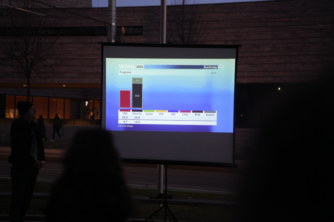 Vor dem Neuen Rathaus haben sich am Abend etwa 200 Personen zu einem Public Viewing versammelt. Applaus gab es beim starken Ergebnis der Linkspartei, aber auch bei FDP und BSW, die zunächst mit weniger als fünf Prozent angezeigt wurden. Allgemein war die Stimmung aber eher bedrückt. „Leipzig nimmt Platz“ hatte zu der Veranstaltung eingeladen.