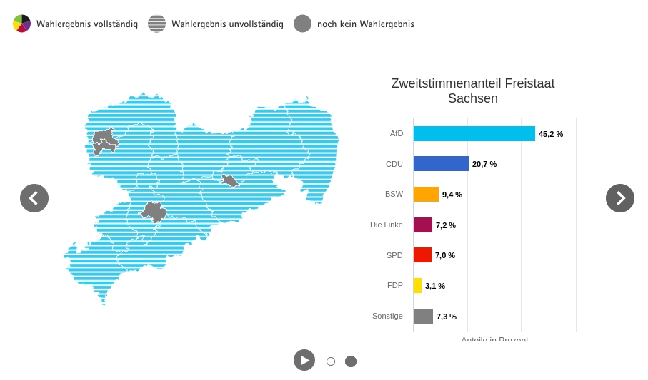 Es wurden zwar erst 270 von 420 sächsischen Gemeinden mit 30 Prozent der Wahlberechtigten ausgezählt, doch es zeigt sich jetzt schon, dass die AfD wieder ein hervorragendes Ergebnis erzielen wird. Dass es bei den 45 Prozent bleibt, die die Grafik aktuell zeigt, ist eher zweifelhaft, aber eine 3 dürfte sicherlich im AfD-Ergebnis vorne stehen.