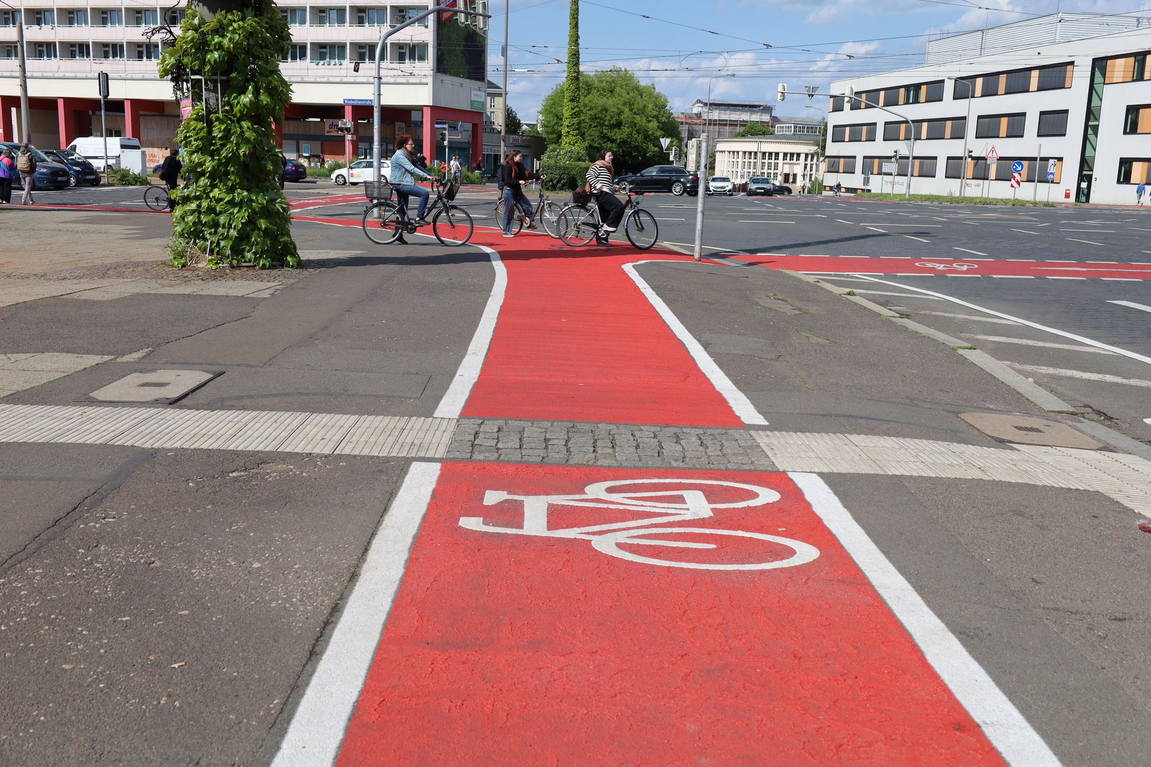 So ist es auch. Am Bayerischen Platz fahren Radfahrer nun auf einem unübersehbaren satten Rot.