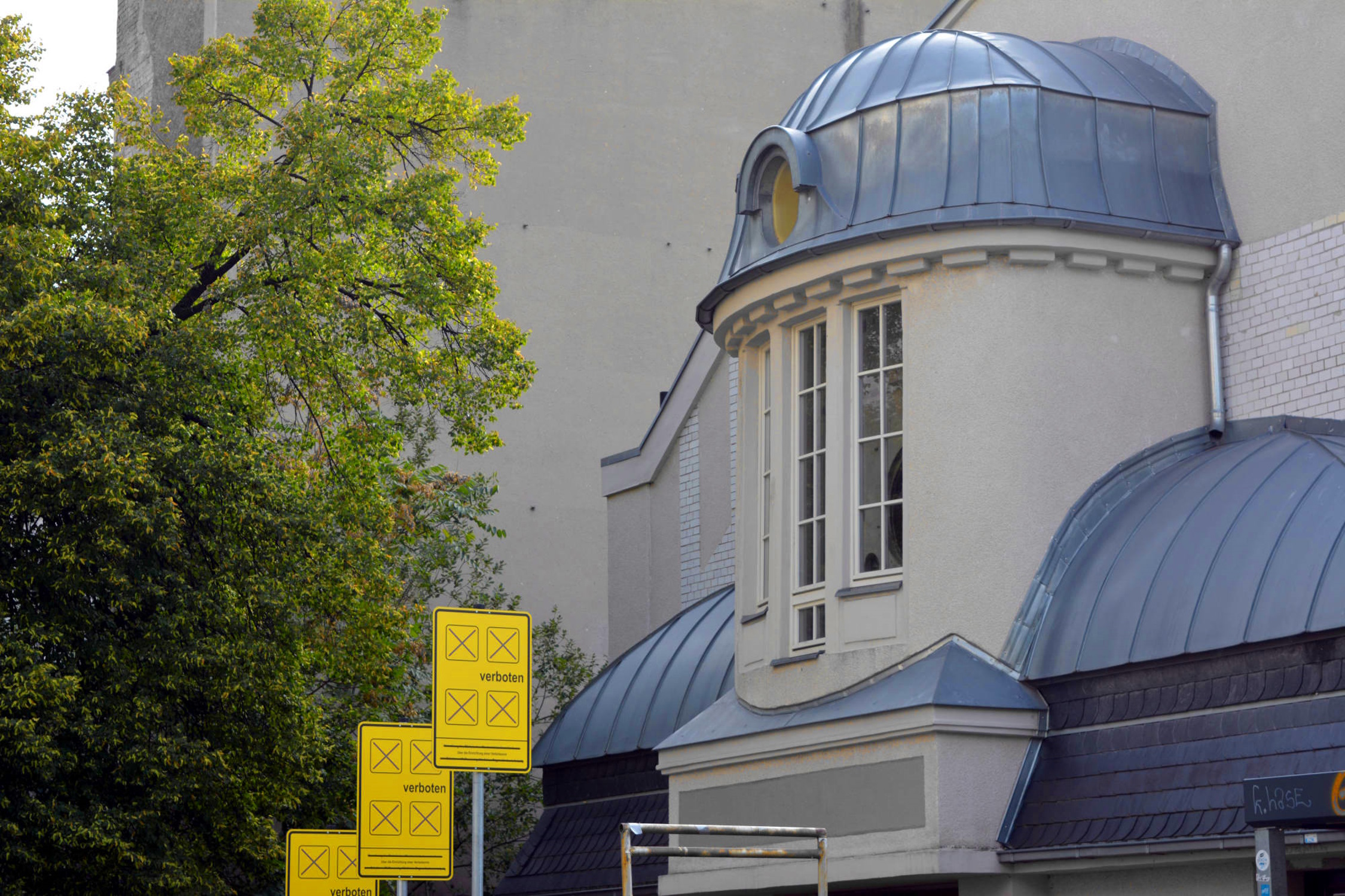 So war beispielsweise selbst das Mitführen eines schweren Buches verboten. Wir wollten dies alles zugespitzt in die Öffentlichkeit zurückspiegeln, deswegen haben wir die Bildsprache der Schilder bis auf das Wesentlichste entleert und im Vorhof des Ost-Passage Theaters aufgestellt, die Internetseite der Verbotszone nachgestellt und unsere eigene Version des Eröffnungsaktes medienwirksam in einem TV-Beitrag platziert“, erklärt Felix Almes das künstlerische Konzept der drei überhohen gelben Verboten-Schilder auf dem Vorhof des Ost-Passage Theaters, die man schon von weitem sehen kann.
