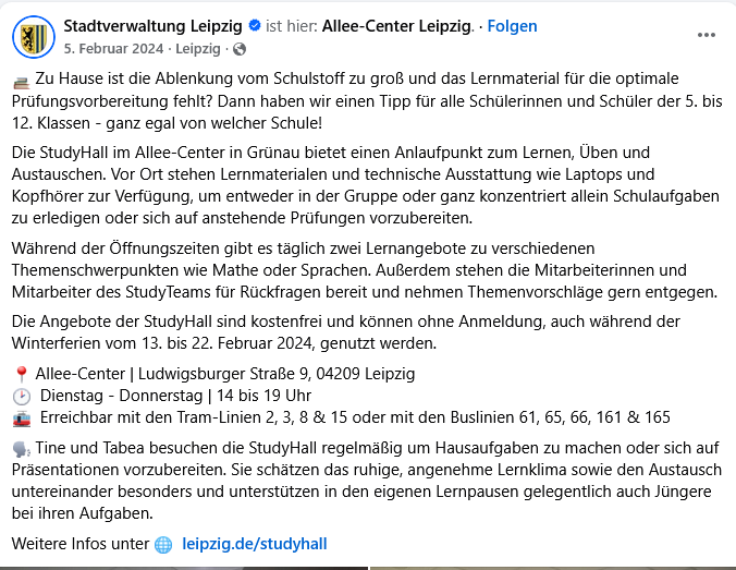 Schaut man im Internet nach, dann findet man auf der Webseite der Stadt Leipzig, dass die Study Hall in Leipzig-Grünau moderne Lernbedingungen bietet. Der Eintrag ist allerdings von Februar 2023 und lautete: „Für Schülerinnen und Schüler ab Klassenstufe 5 hat die Stadt Leipzig ein Konzept entwickelt, das zu mehr Bildungs- und Chancengerechtigkeit verhelfen soll sowie soziale und pandemiebedingte Nachteile ausgleichen möchte: die Study Hall. Die erste Einrichtung in Leipzig, die von BILD hilft e.V. ‚Ein Herz für Kinder‘ unterstützt wird, öffnet jetzt ihre Türen.“