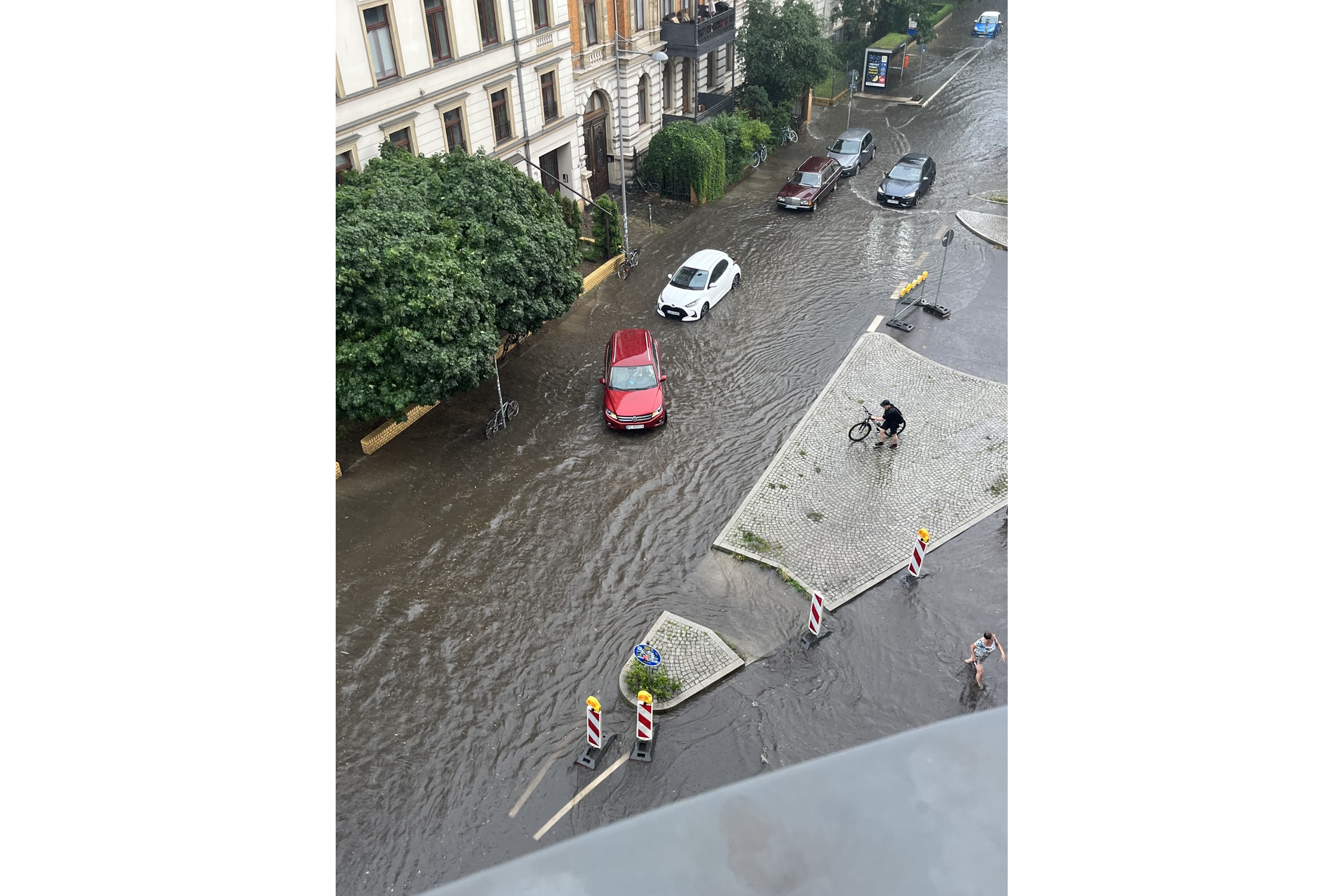 Überschwemmung nach einem kurzen Starkregen in der August-Bebel-Straße im Sommer 2024. Foto: Ökolöwe