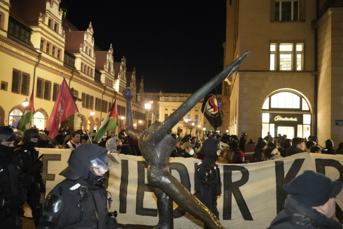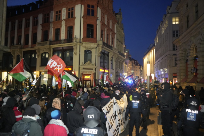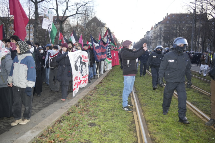 Nachdem der mit großem Eskalationspotenzial befürchtete Demo-Samstag in Leipzig zunächst recht entspannt gestartet war, hat sich die Lage etwas erhitzt und zugespitzt. Nach einiger Verzögerung ist der pro-Palästina-Demozug mit dem Namen „Antifa means: Free Palestine“ auf einer geänderten Route am Nachmittag vom Connewitzer Kreuz aus Richtung City aufgebrochen, begleitet von Gegenprotest.