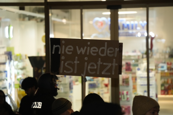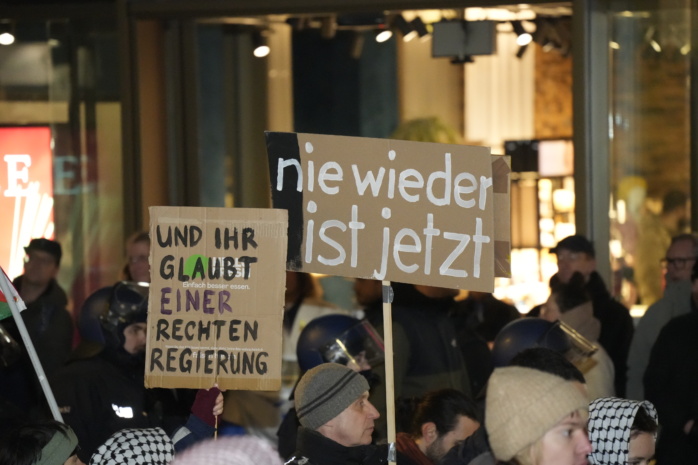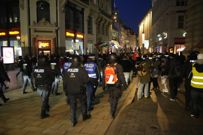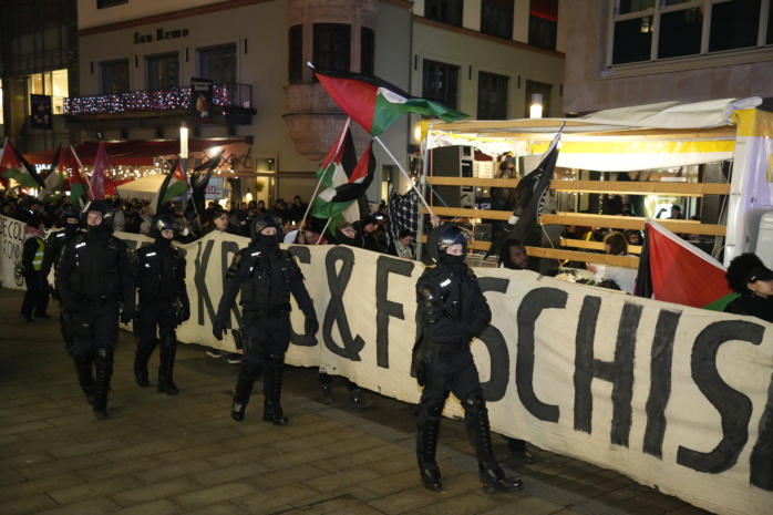 Währenddessen ist der Aufzug „Antifa means: Free Palestine“ am Südplatz angelangt. Die Polizei weist wiederholt per Lautsprecher auf das Vermummungsverbot hin. Es gab kurz nach 16:00 Uhr mindestens drei polizeiliche Maßnahmen, so einer unserer Reporter.