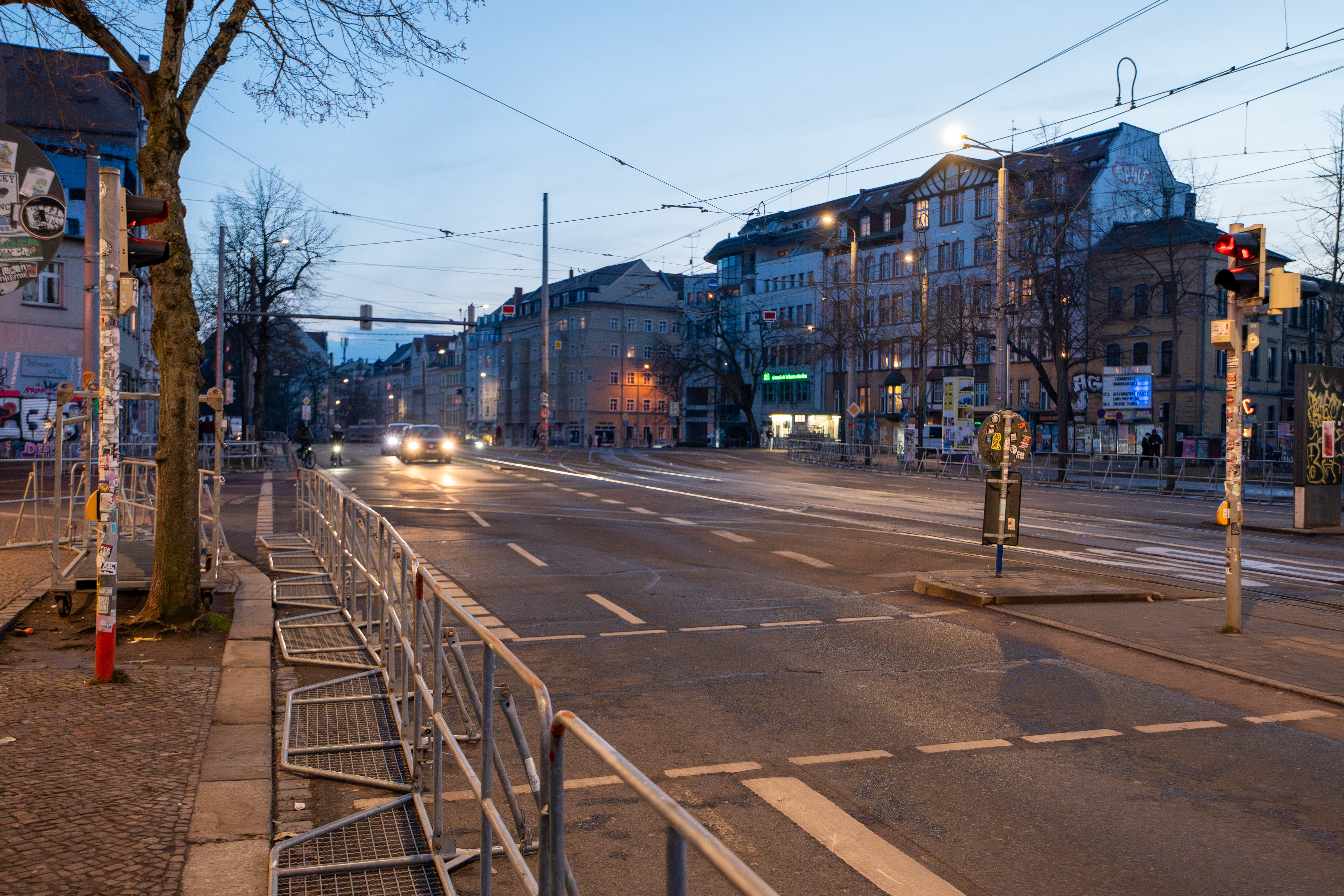 Das Connewitzer Kreuz liegt indes friedlich in der Abenddämmerung. Wenige Kilometer weit weg hat der Aufzug die Innenstadt erreicht, wo wegen des Verstoßes gegen das Vermummungsverbot erneut eine Person aus der Demonstration durch die Polizei herausgegriffen wurde. Die Demo von „Antifa means: Free Palestine“ steht wieder einmal und kommt nicht voran. Inzwischen (Stand: 17:30 Uhr) geht es wieder weiter.