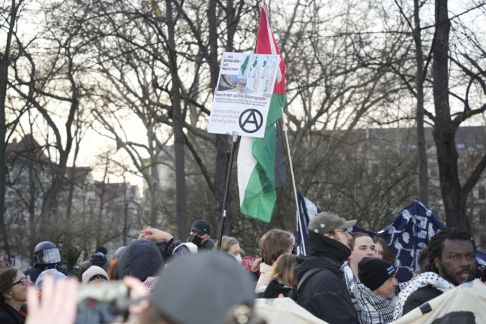 Am Rande der Demostrecke hat sich immer wieder dieser Gegenprotest etabliert, so auch am Alexis-Schumann-Platz, wo es, wie auch andernorts, zumindest zu Anbrüllerei und Wortgefechten mit Gegendemonstranten auf dem Bürgersteig kam. Während der Zwischenkundgebung führte die Polizei eine weitere Ingewahrsamnahme wegen Verdachts von Straftaten gegen Teilnehmer von „Antifa means: Free Palestine“ durch. Nach Angaben unserer Reporter vor Ort wurde dabei ein Transparent zerstört.