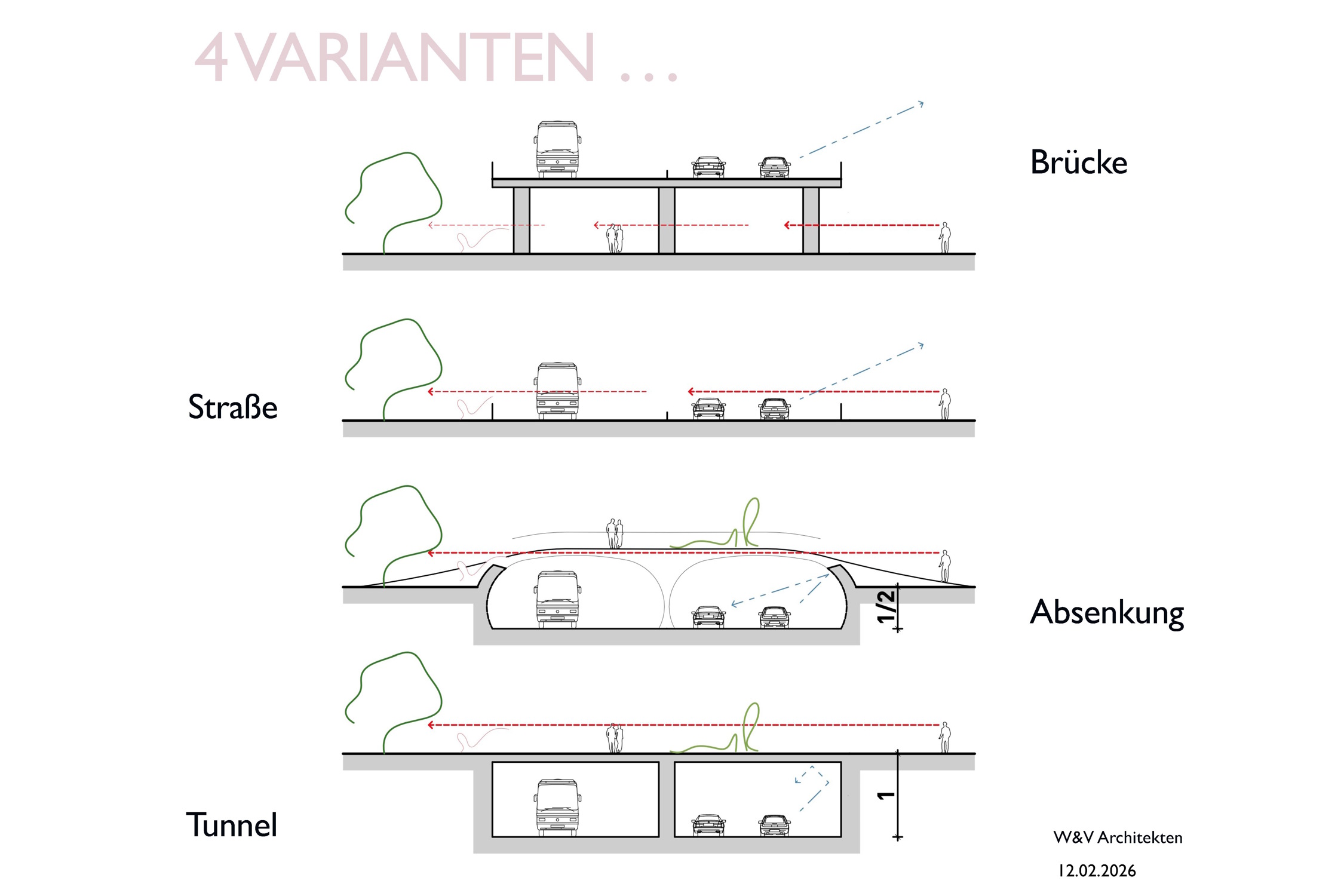 Vier verschiedene Lösungen für die B2 im Agra-Park. Grafik: W&V Architekten