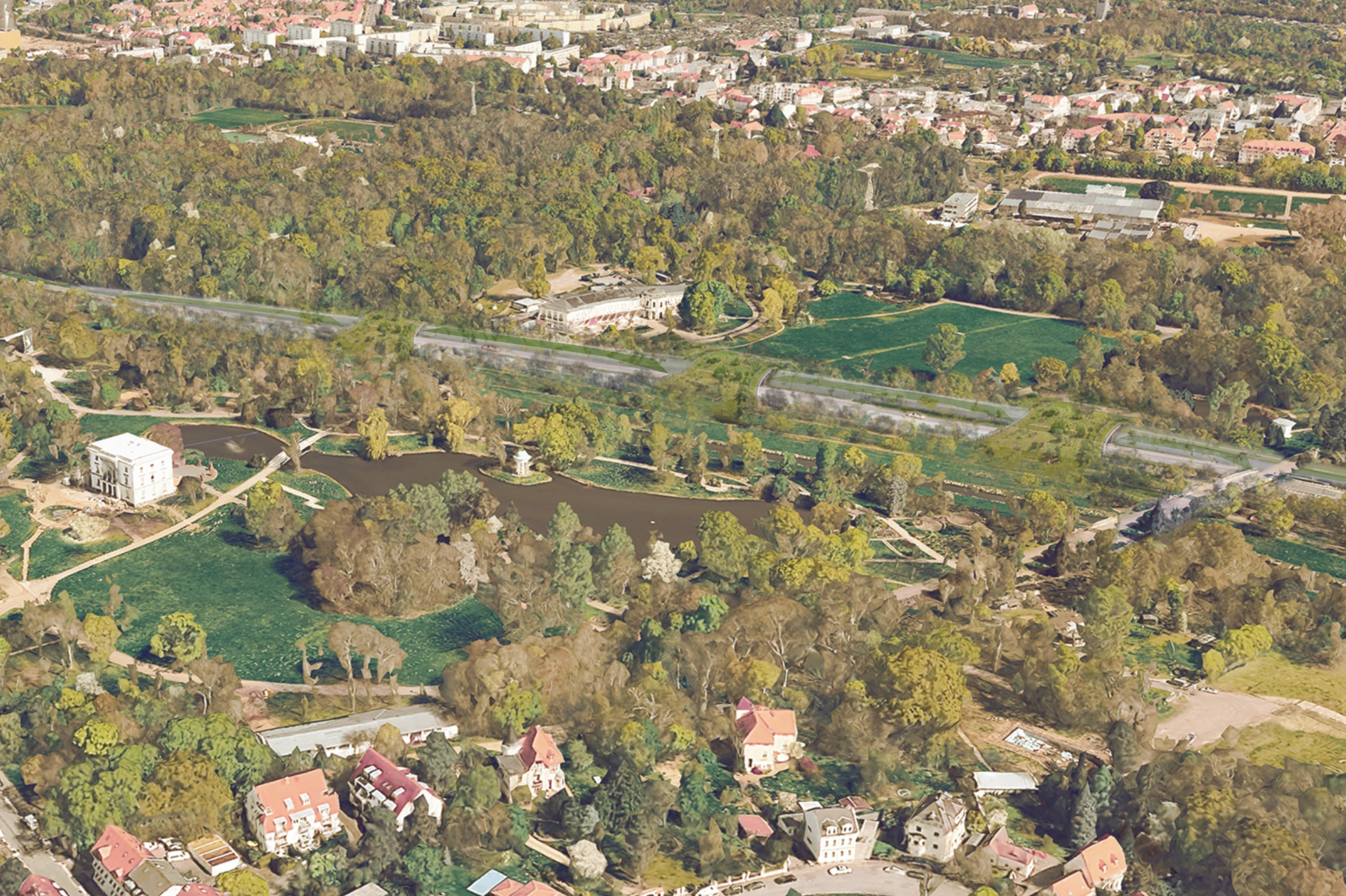Die Variante Absenkung als Lösung für den Agra-Park. Visualisierung: W&V Architekten