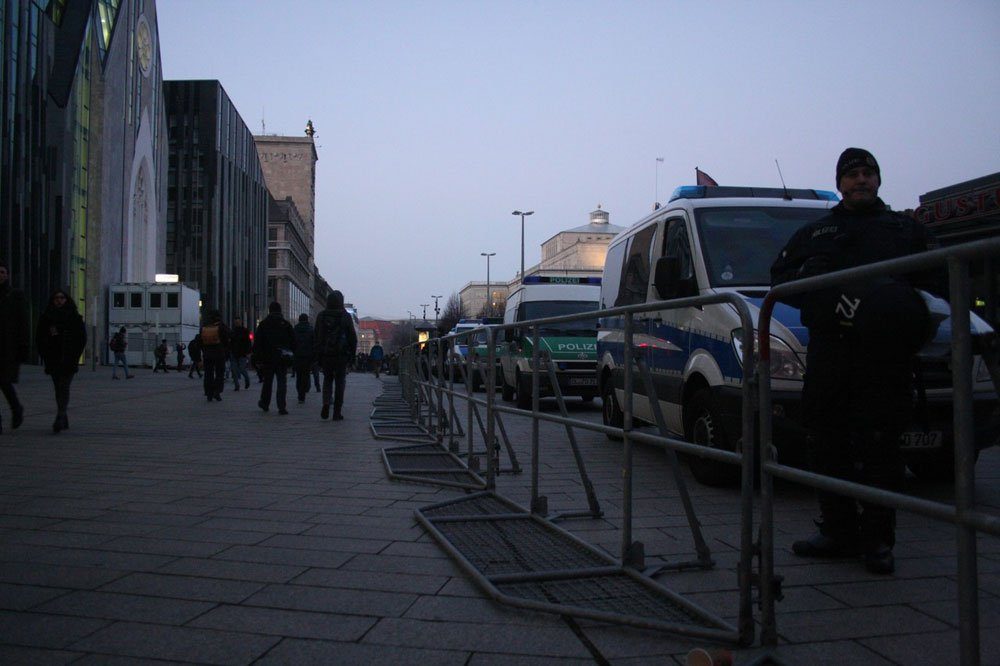„Damals bei den Montagsdemonstrationen durften wir noch über den Ring ziehen, warum dürfen die das heute?“ An der Moritzbastei treffe ich eine Bekannte, die vergeblich nach einem Ort sucht, wo sie ihren Protest loswerden kann. Ziehen deshalb so viele ziellos durch die Stadt, immer wieder von den Absperrungen zurückfedernd? Gemeinsam schreiten wir zur S-Bahn-Haltestelle Wilhelm-Leuschner-Platz an der Musikschule Leipzig. Hier ist wenig los. Mit Hamburger Gittern und zusammengestellten Wagen versucht die Polizei zunächst, die Gegendemonstranten vom Ring fernzuhalten.