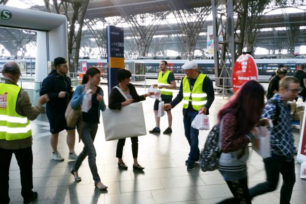 In den frühen Morgenstunden des Mittwochs, 31. Mai, machten sich in Leipzig aktive Gewerkschafterinnen und Gewerkschafter auf, um am Zugang zur S-Bahn-Station Hauptbahnhof Pendler zu einem Kaffee oder Tee „to go“ einzuladen.