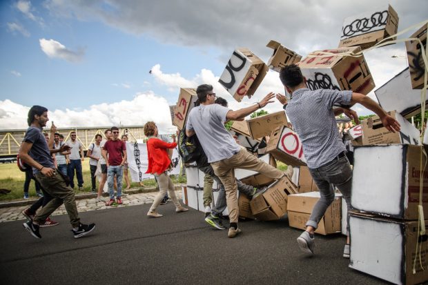 Am Ende der Aktion rissen die Teilnehmerinnen und Teilnehmer unter Jubel gemeinsam eine symbolische Mauer der „Festung Europa“ ein. In einer anschließenden Rede wurden konkrete Forderungen gestellt.