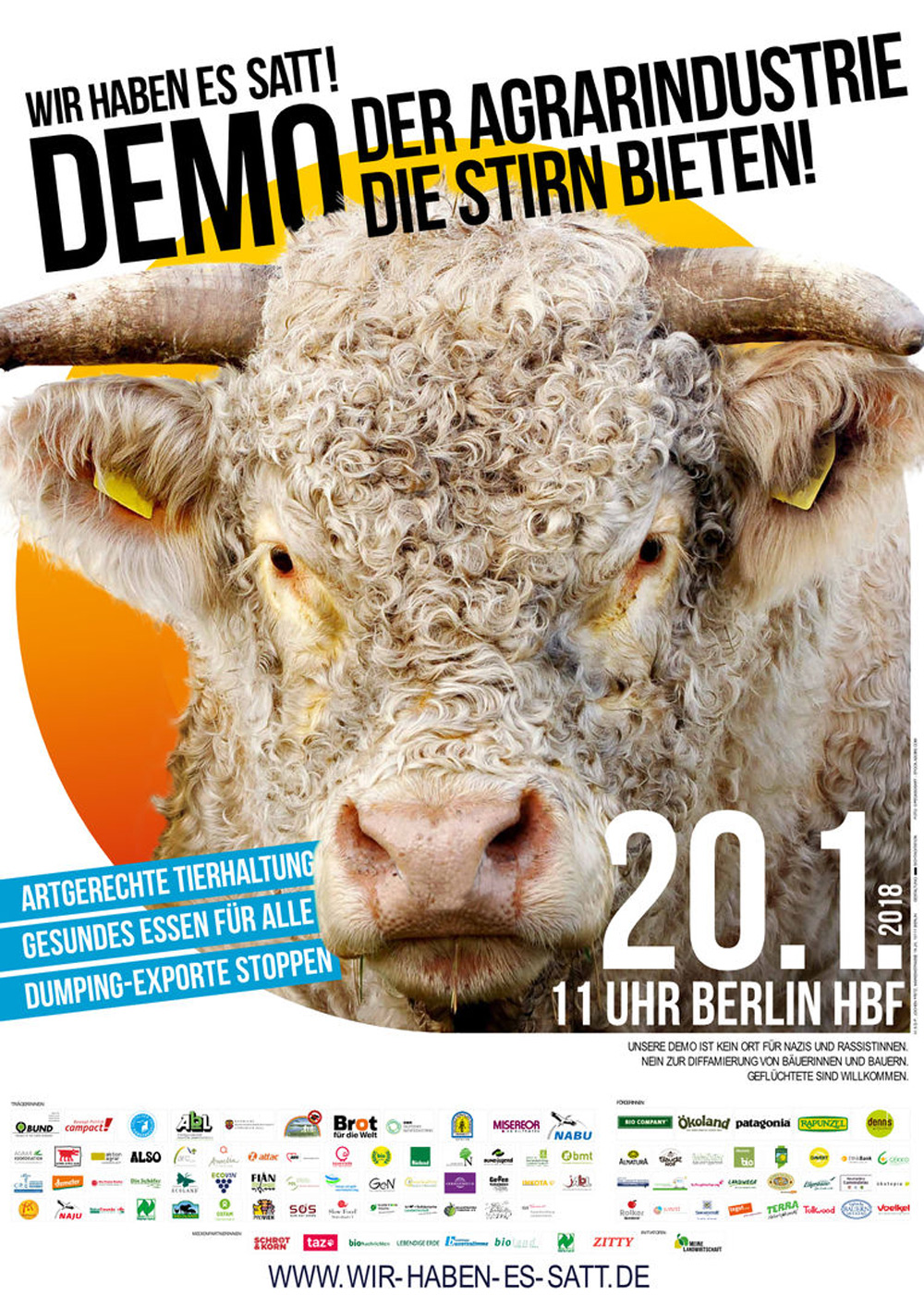 „Schluss damit! – Wir haben es satt!“ ist deshalb wieder das Motto der Großdemonstration am 20. Januar 2018 in Berlin, zu der ein breites Bündnis aus Bauern-, Umwelt-, Verbraucher- und Tierschutzorganisationen aufruft.