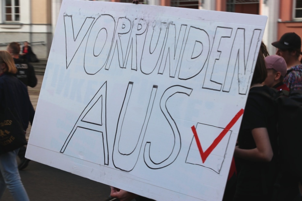 Und während sich praktisch zeitgleich die Zeitungsseiten mit Schlagzeilen von Ratlosigkeit bis zu den ersten Vergewisserungen füllten, dass Deutschland doch irgendwie, vielleicht ja doch noch mit Joachim Löw weitermachen wird, hielt ein Vertreter der Linksjugend am Kleinen Wilhelm-Leuschner-Platz eine kurze Rede, die der ganzen Demo-Sache dann doch einen gewissen Sinn und Tiefe verschaffte.