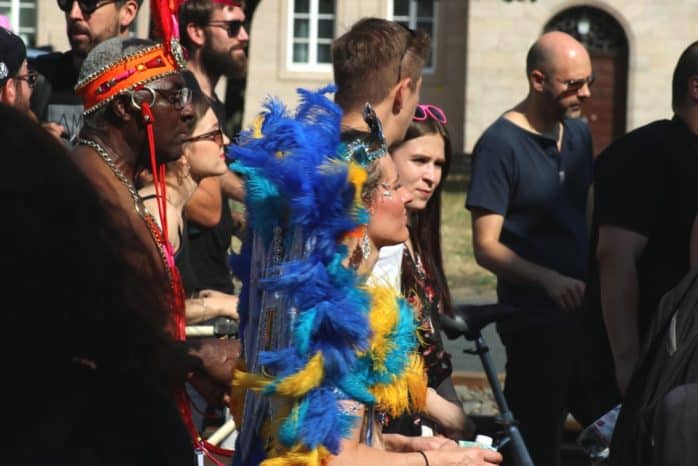 „Wenn bis zur absoluten Eskalation gewartet wird – bis z.B. die Flüchtlingshilfe der Vereinten Nationen Menschen in Flüchtlingsunterkünften nahe Syrien wegen fehlender Mittel nicht mehr versorgen bzw. gar am Leben halten kann – dann besteht kein Recht darauf sich jetzt über `zu viele` Flüchtlinge aufzuregen oder gar menschenrechts- und verfassungswidrige Obergrenzen zu fordern. In dieser aufgeladenen Stimmung, in der uns die `Gaskammer-Blicke` der Herren Höcke & Co. beim Sprechen über eine 188-Grad-Wende in der deutschen Erinnerungskultur entgegenschlagen, möchten wir mit euch hier und heute sowie in Zukunft für demokratische Werte einstehen und dem tumben Hass entgegensetzen: Vielfältigkeit statt Einfältigkeit!“