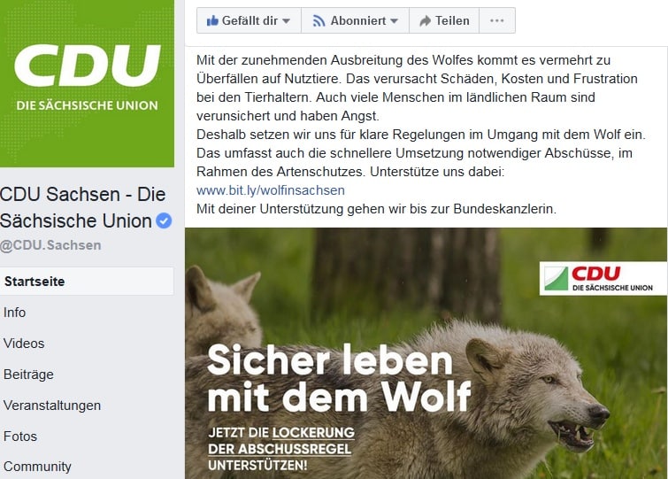 Bei der Jagd auf Wählerstimmen für die Landtagswahlen im kommenden Jahr nimmt die CDU in Sachsen nun ein lebendes Objekt ins Fadenkreuz: Seit vergangener Woche fordern die Christdemokraten eine Lockerung der Abschussregeln für den Wolf. Mit einer Online-Kampagne zählen sie die Stimmen, die den Abschuss künftig vereinfachen wollen. Der Naturschutzbund (NABU) Sachsen und der Bund für Umwelt und Naturschutz Deutschland (BUND) Sachsen sind entsetzt – und verlangen ein klares Bekenntnis zum Schutz des Tieres von der sächsischen Politik.