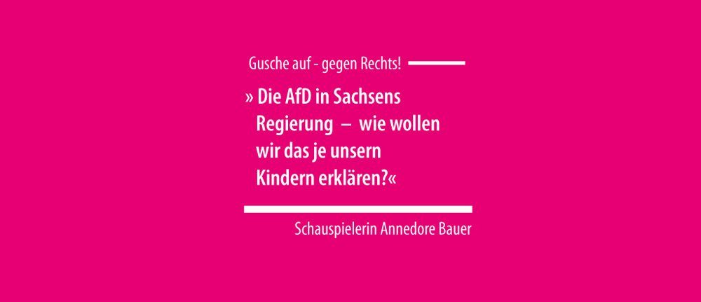 Die Kampagne „Gusche auf – gegen Rechts!“ wird von engagierten Demokrat/-innen in Sachsen als überparteiliche Plattform genutzt, um gegen die AfD und ihre Politik deutlich Position zu beziehen. Dazu wird es ab sofort und bis zum Sommer 2019 zahlreiche Filme, Vorträge, Plakataktionen und andere kreative Formen im öffentlichen Raum geben, um über die Ziele und die Gefahren der Partei aufzuklären.