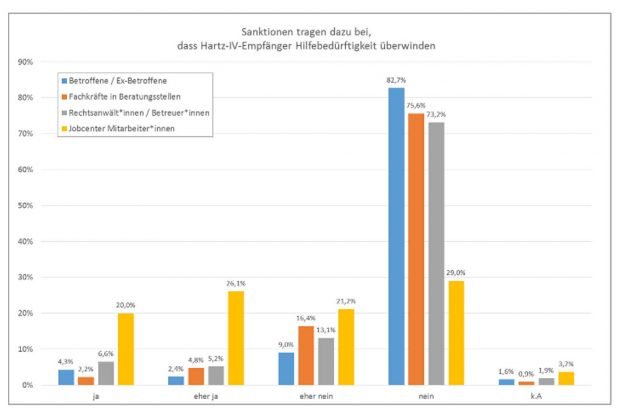 Die Detailergebnisse sind noch erschütternder, weil sie zeigen, wie sehr gerade Jobcentermitarbeiter/-innen in ihrer Blase leben und mehrheitlich daran glauben, dass die Sanktionen tatsächlich helfen. Während auch Sozialberater und Rechtsanwälte sehen, dass das Gegenteil der Fall ist. Haben Betroffene familiäre, gesundheitliche oder psychische Probleme, wird ihnen das im Jobcenter fast immer als Faulheit und Bequemlichkeit ausgelegt.
