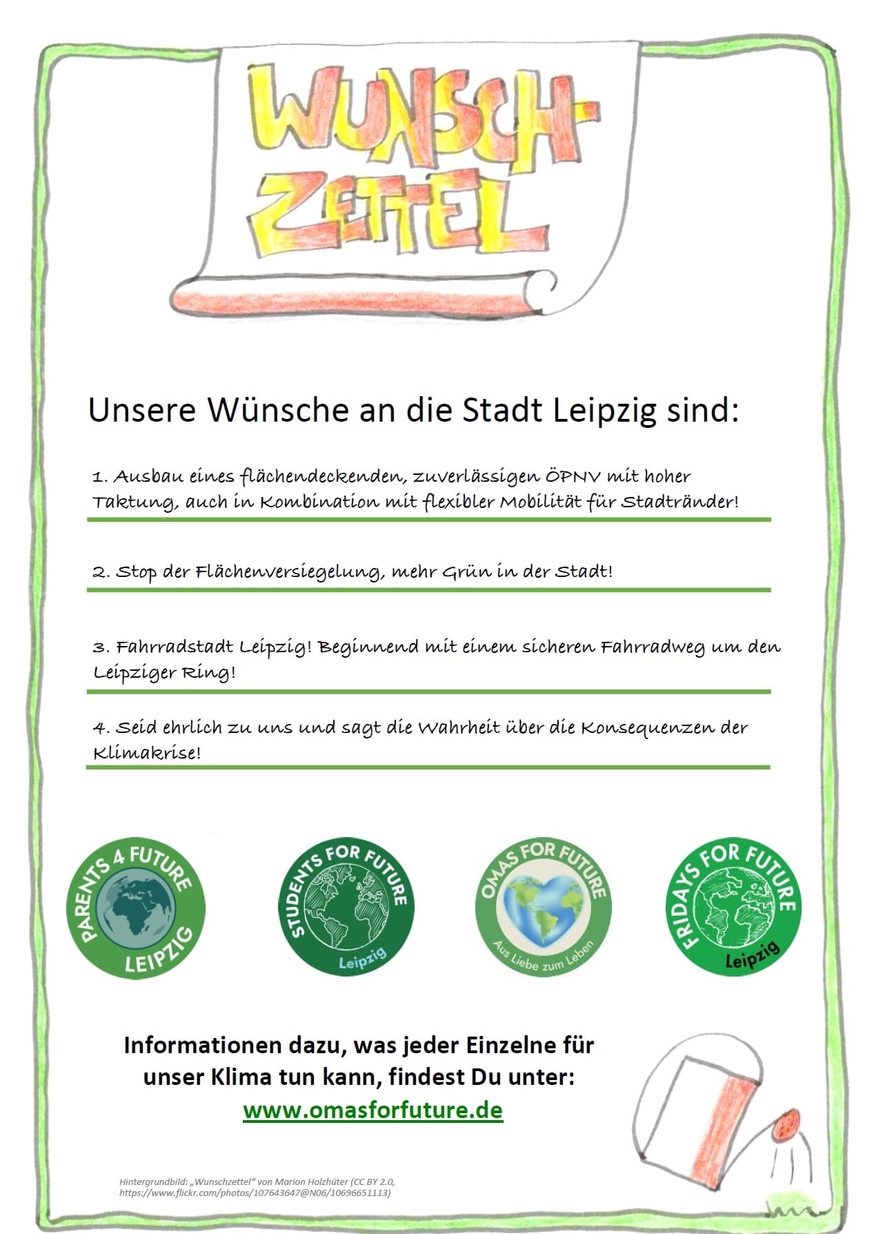 In der Vorweihnachtszeit, dazu auch noch am Rabatttag „Black Friday“, hatten die Leipziger Ortsgruppen von „Parents for Future“ sowie „Omas for Future“ Wunschzettel für den Klimaschutz gesammelt. Die in verschiedenen Aktionen gesammelten Wünsche wurden dann nach dem Globalen Klimastreik am 29. November in der Leipziger Petersstraße zu einem großen mit Lichtern geschmückten Weihnachtsbaum gelegt. Zahlreiche Vorübergehende informierten sich und fügten Wünsche hinzu.