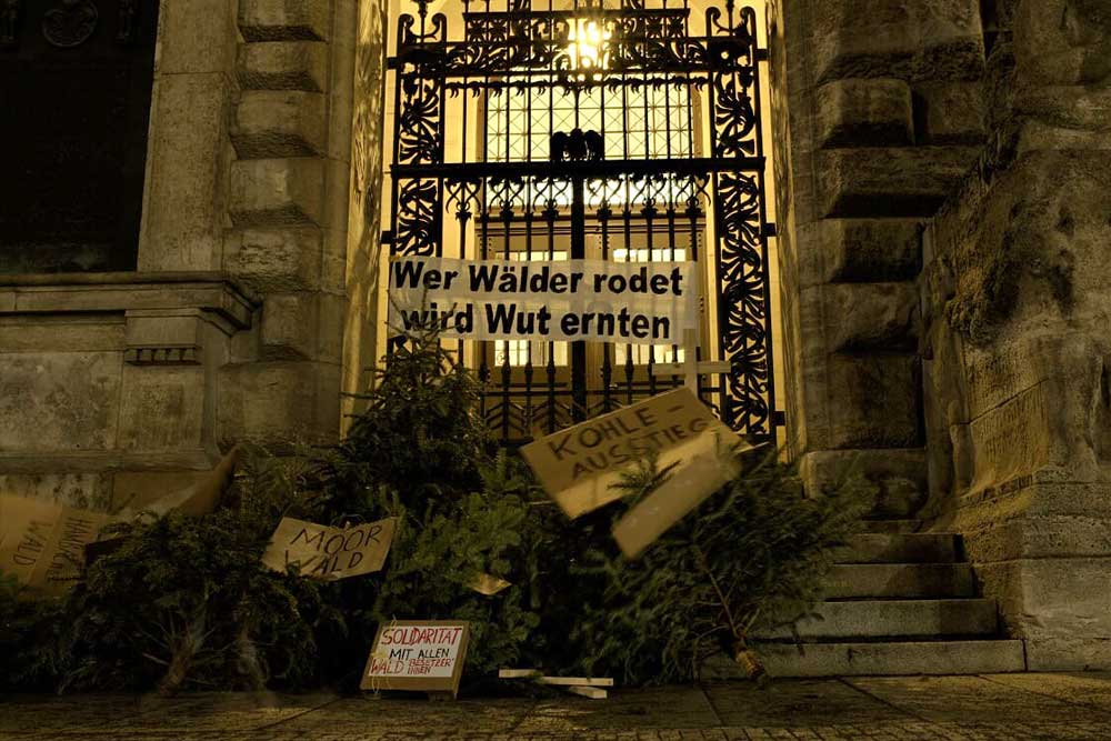 „Wir Menschen haben bereits das sechste Massensterben der Erdgeschichte ausgelöst. Trotzdem musste der Hambacher Forst dem Kohleabbau und der Dannenröder Forst einer Autobahn weichen. Und das, obwohl diese Industrien die katastrophale Erderhitzung weiter vorantreiben“, empört sich Luise Ebenbeck, Aktivistin bei Extinction Rebellion, und erklärt, dass die Christbäume daher symbolisch für den Verlust der Artenvielfalt stehen.