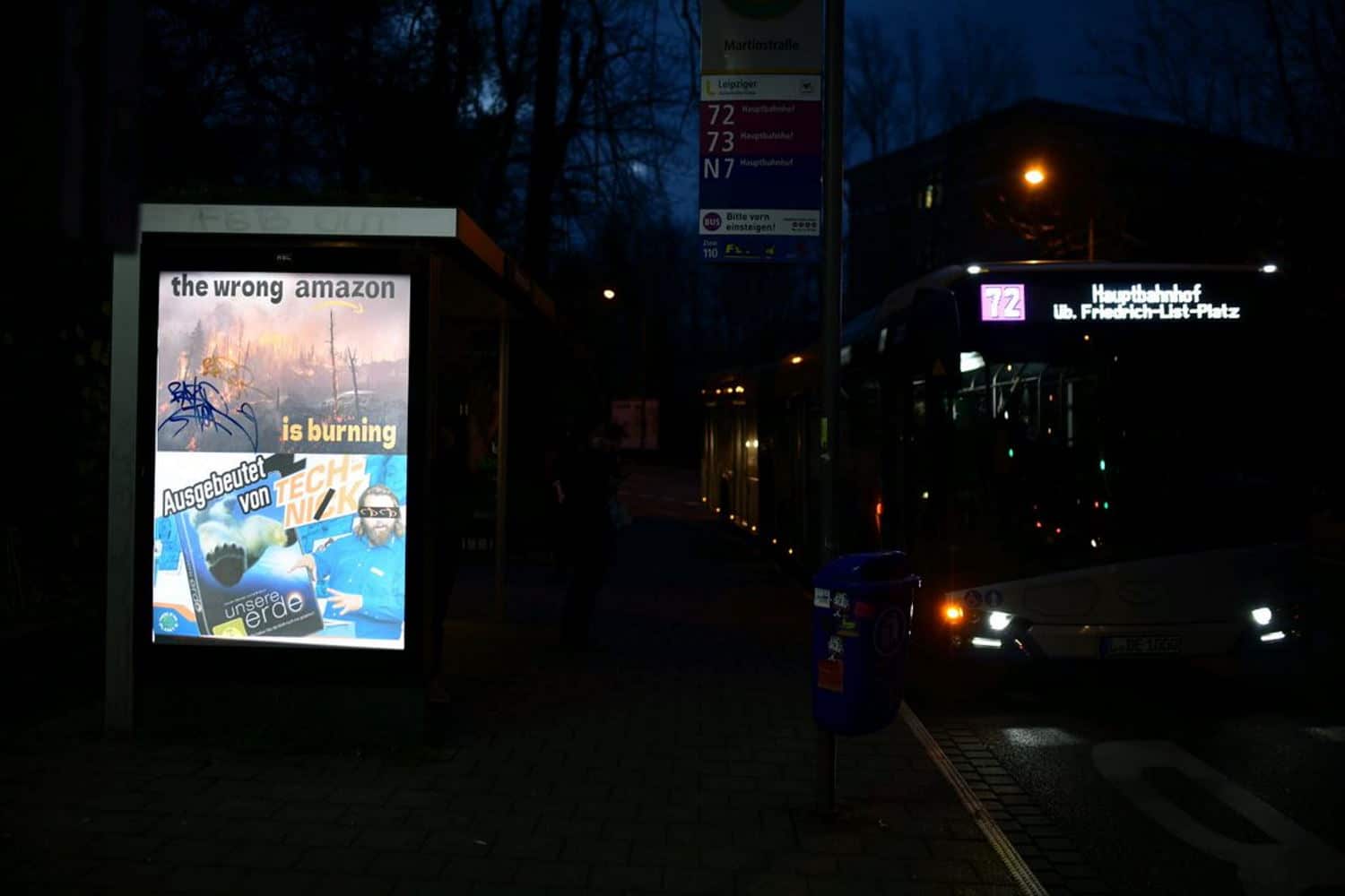 Bereits am frühen Morgen wurden deshalb von „Extinction Rebellion“ verschiedene Plakate mit Aufschriften wie „Ein schlechter Freitag für unsere Zukunft“ oder „The wrong Amazon is burning“ aufgehängt. Am Nachmittag verteilten als Amazon-Pakete verkleidete Menschen Werbecoupons in der Leipziger Innenstadt. Diese boten zum Beispiel „Kostenfreie Datenspeicherung bei jedem Einkauf“ oder „15 Stunden/Tag für Sie da“.