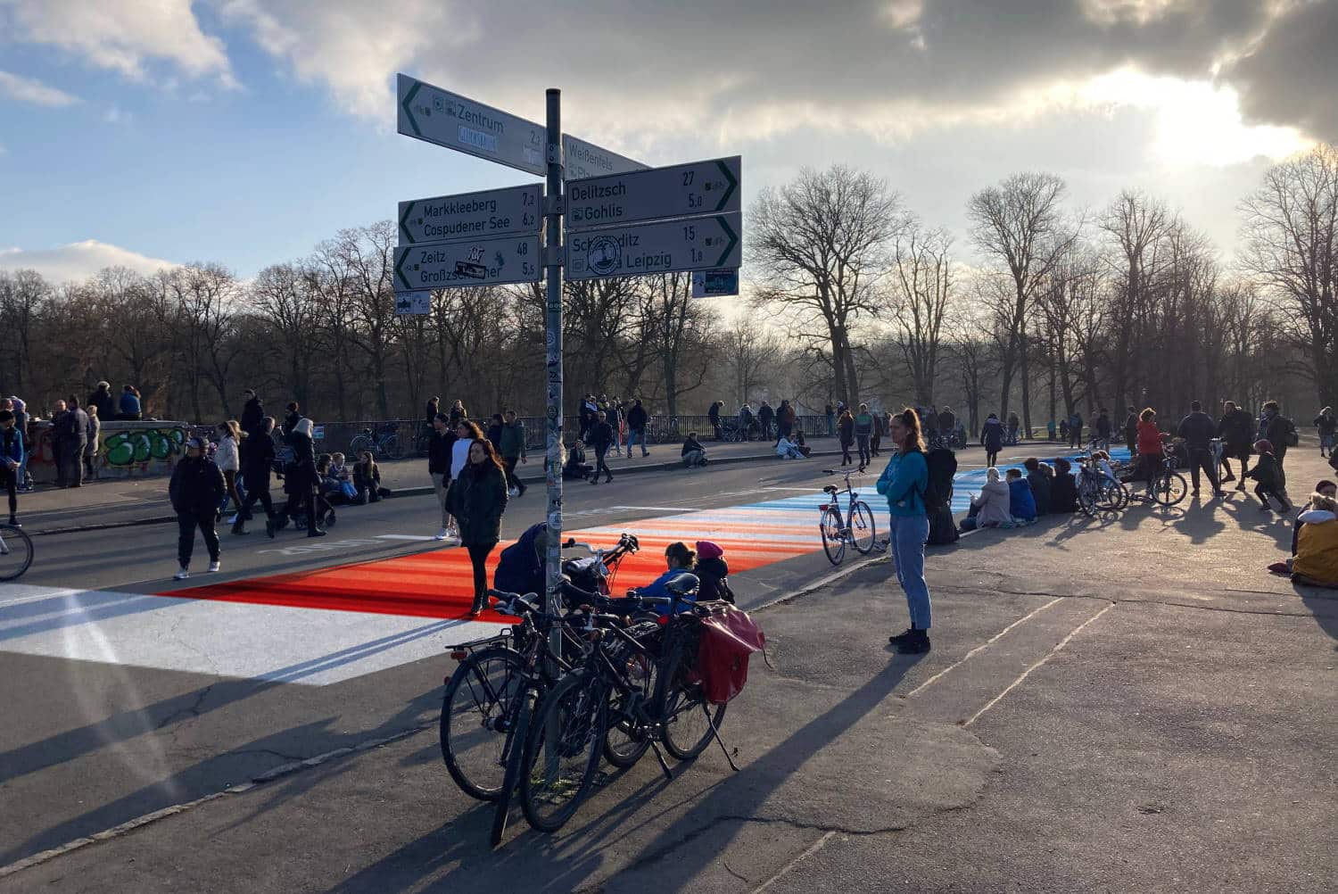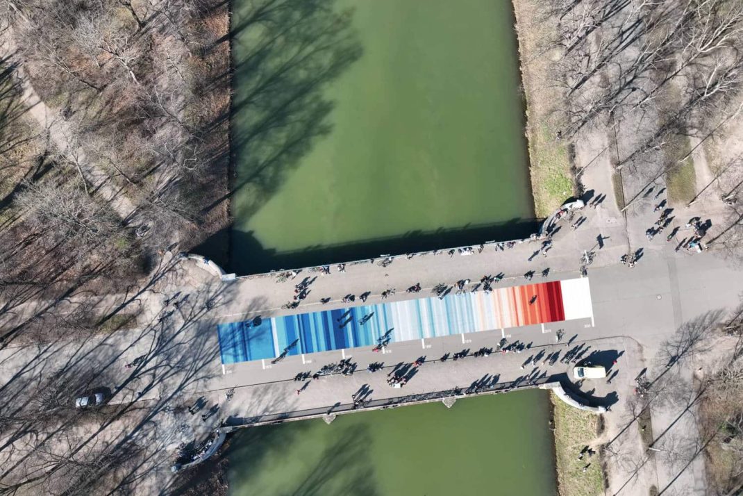 Die Auftragung der Warming Stripes auf der Sachsenbrücke beginnt bereits in der Woche nach Ostern. Um Langlebigkeit, Umweltverträglichkeit und Sicherheit zu gewährleisten, wurde für die Umsetzung eine Firma für Straßenmarkierungsarbeiten beauftragt.
