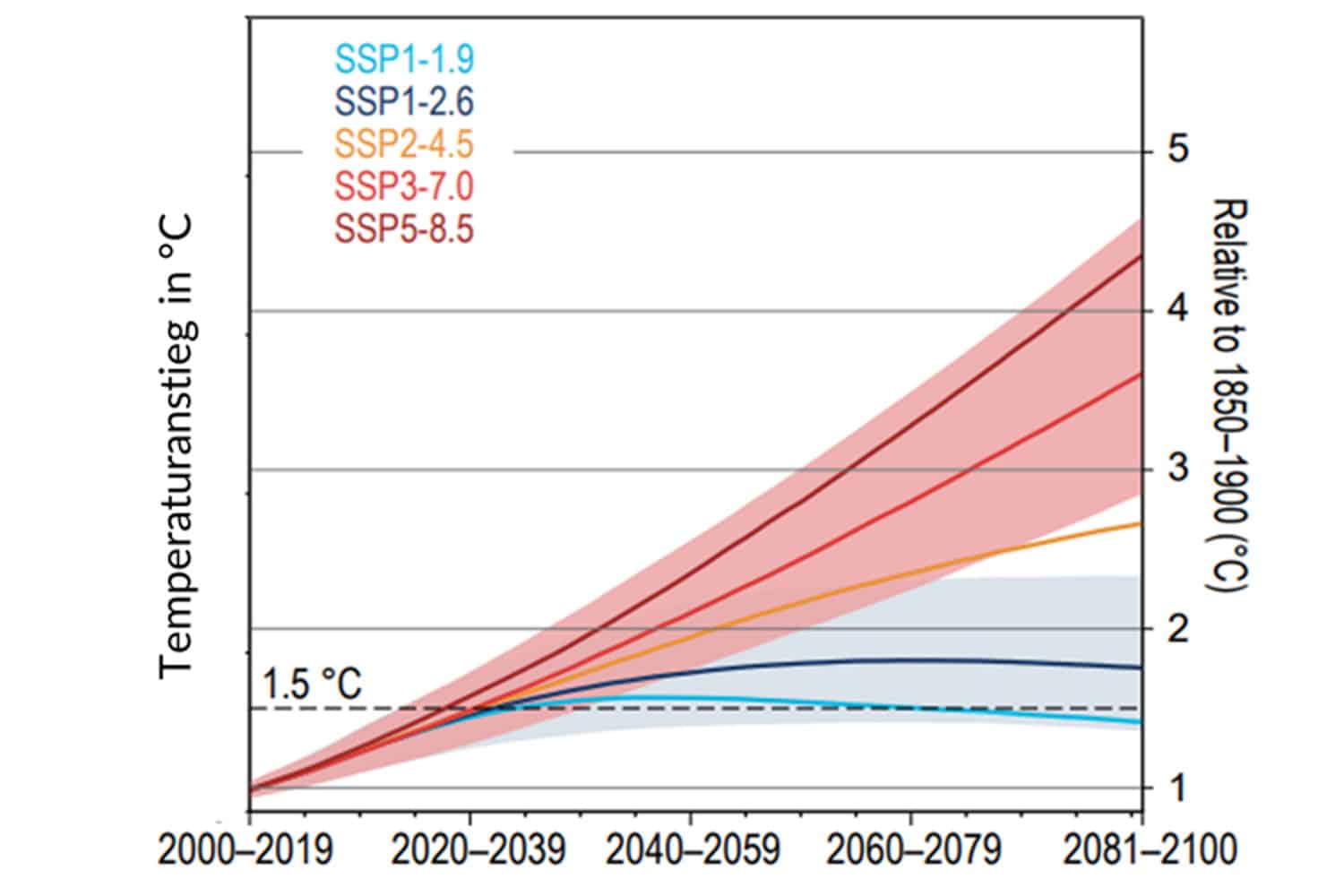 Der Weltklimarat (IPCC) publiziert in seinen Berichten Szenarien (socio-economic pathways, SSP), die beschreiben, unter welchen Annahmen welches Temperaturziel erreicht werden kann. Nur im SSP 1-1,9 Szenario wird das 1,5 Grad Ziel zum Ende des Jahrhunderts erreicht. Auch dafür ist es nach einer schnellen Reduktion der Emissionen bis 2050 erforderlich, CO₂ aus der Atmosphäre zu entnehmen. Zwischenzeitlich wird die Temperaturerhöhung von 1,5 Grad überschritten (siehe Abbildung 3) [10].