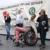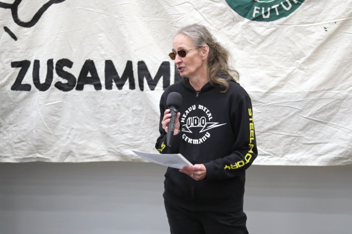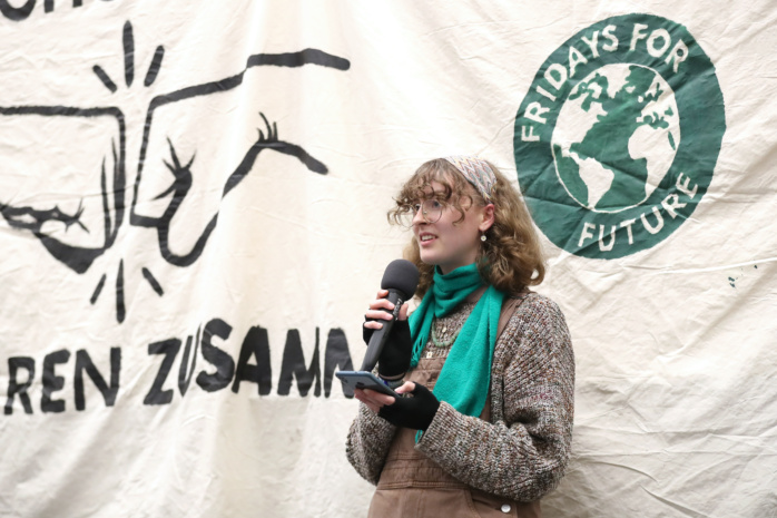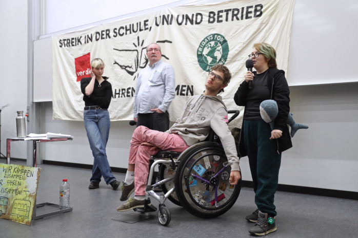 Rosalie und Noa von „Rollender Widerstand“, einer Klimagruppe, die sich für Barrierefreiheit einsetzt: „Wir haben ein paar Minimalforderungen für Barrierefreiheit im öffentlichen Nahverkehr dabei, denn sonst müssten wir stundenlang reden. Wenn man zum Beispiel mit dem Regio fährt, muss man sich oft anmelden, weil die Bahnsteige nicht abgesenkt sind und man nicht alleine reinkommt. So wird spontanes Reisen zu einer unmöglichen Herausforderung.“