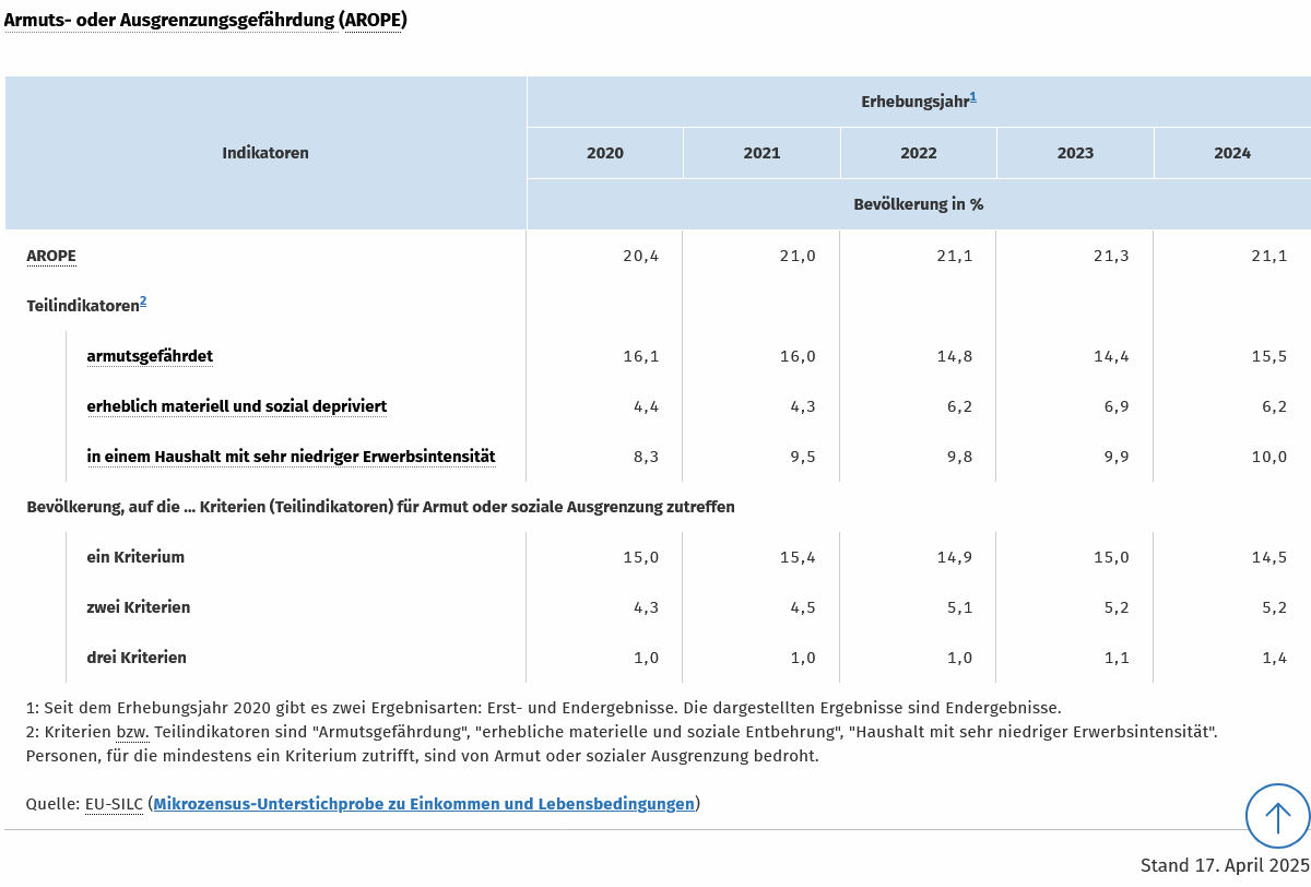 Schauen wir auf die Zahlen. In Deutschland sind laut Statistischem Bundesamt, zum Stand April 2025, 21,1 Prozent der Menschen armuts- oder ausgrenzungsgefährdet. 15,5 Prozent sind armutsgefährdet und 6,2 Prozent der Gesamtbevölkerung müssen erhebliche materielle und soziale Entbehrung in Kauf nehmen.