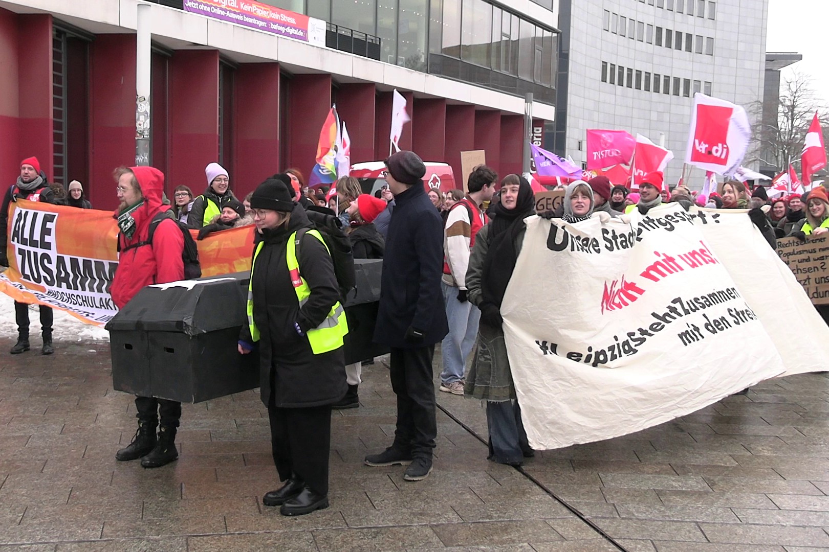 11:00 Uhr: Demo durch die Leipziger Innenstadt mit Zwischenkundgebung, Redebeitrag an der Universität zum Tarifvertrag für Studierende (TVStud)