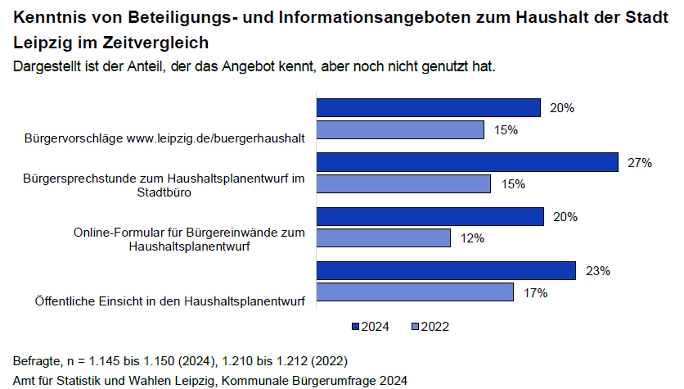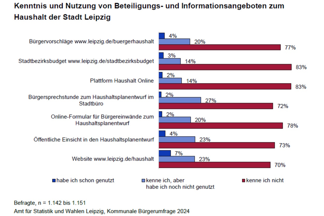„Trotz geringer Nutzung kennt mehr als ein Viertel der Menschen in Leipzig die Bürgersprechstunde zum Haushaltsplanentwurf im Stadtbüro (27 Prozent Kenntnis), die öffentliche Einsicht in den Haushaltsplanentwurf und die Website zum Haushalt (jeweils 23 Prozent Kenntnis) sind in ähnlichem Ausmaß als Informationsmöglichkeit bekannt.