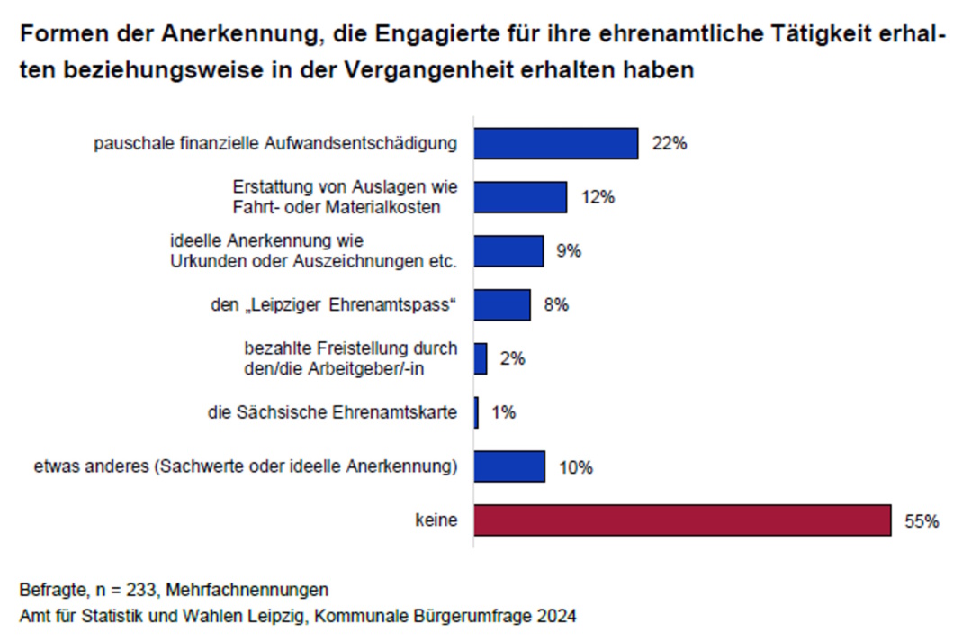 Aber welche Anerkennung gibt es tatsächlich? „Die Mehrheit der Leipziger Ehrenamtlichen hat bislang keine Anerkennungsleistung – sei es materiell oder ideell – für die eigene Tätigkeit erhalten. Dieser große Anteil weist darauf hin, dass die Ehrenamtlichen vor allem aus einer eigenen, intrinsischen Motivation heraus tätig sind und nicht aufgrund einer dokumentierbaren Anerkennung als Gegenleistung.