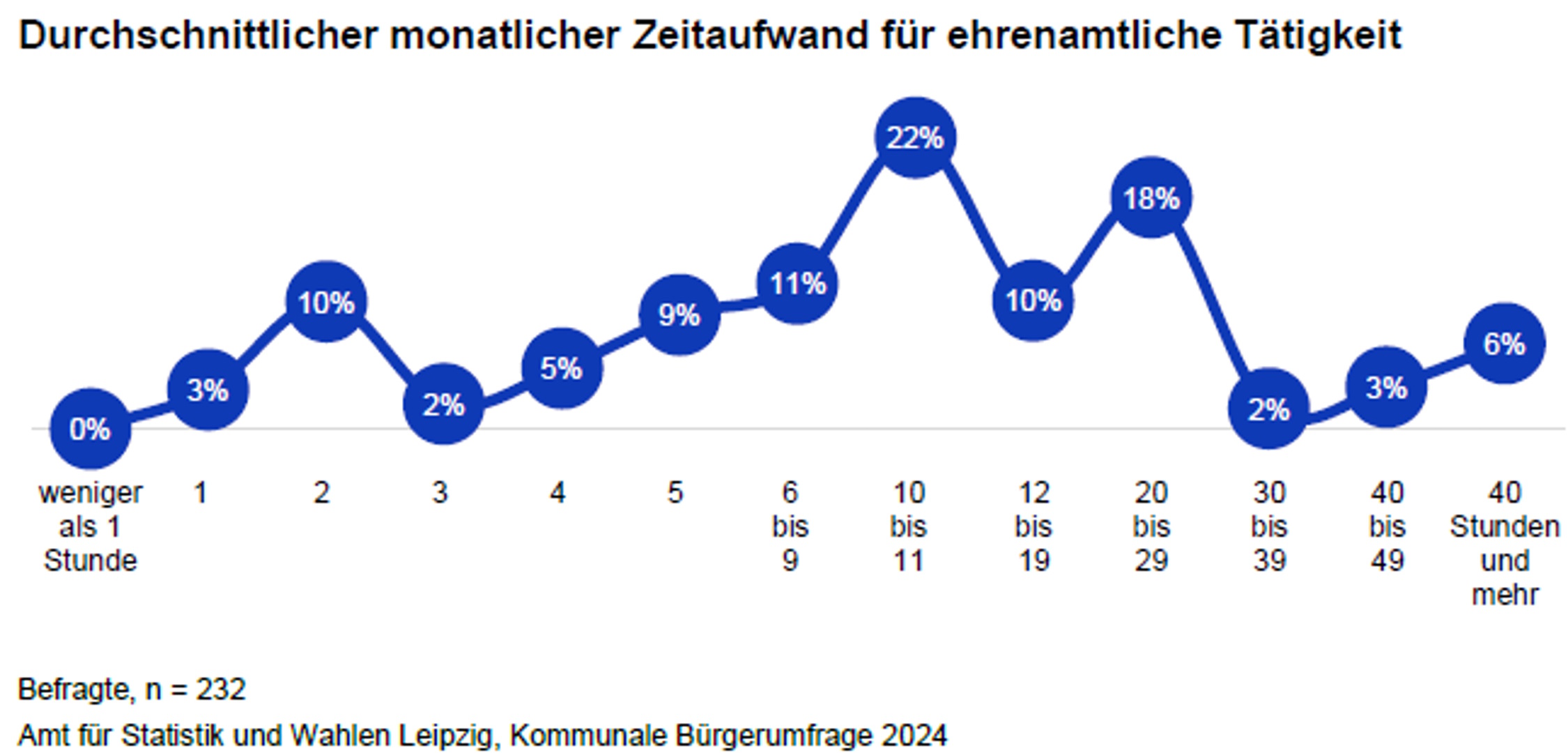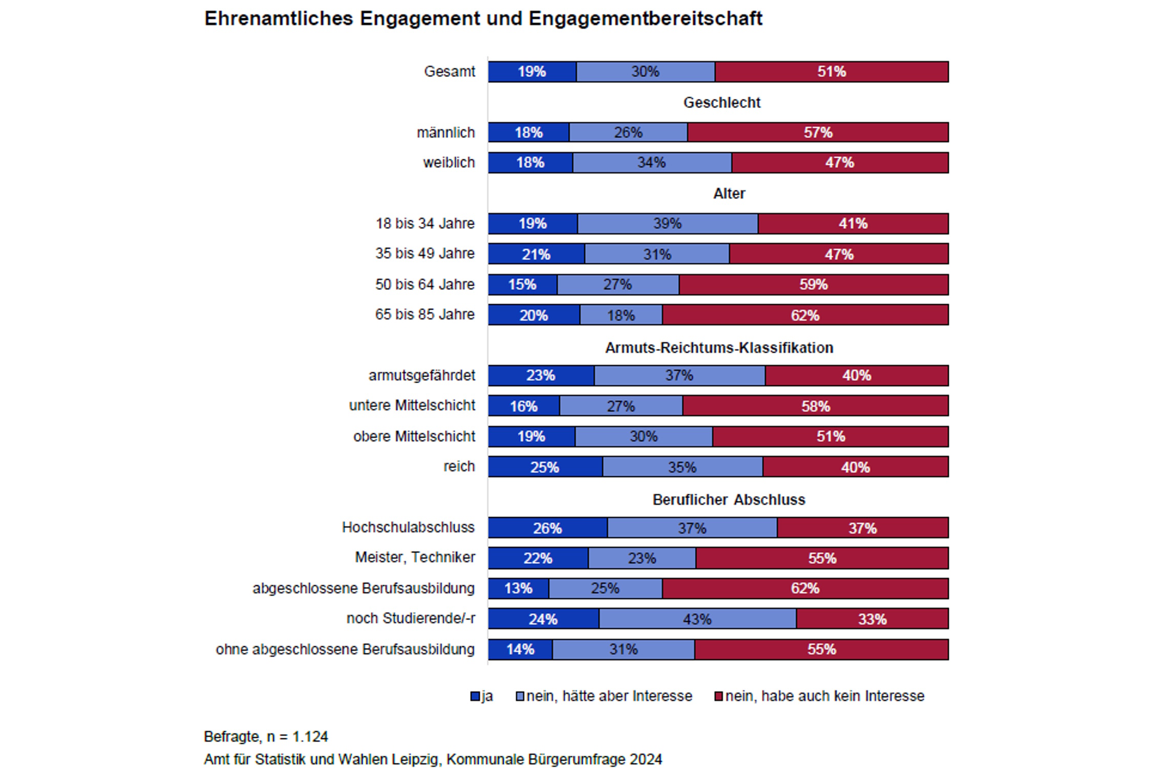 „Knapp ein Fünftel der Leipzigerinnen und Leipziger arbeitet ehrenamtlich (Engagementquote: 19 Prozent), 30 Prozent waren 2024 noch nicht engagiert, haben aber Interesse daran“, fasst der Bericht zur Bürgerumfrage 2024 zusammen, was die Befragten zu ihrem Engagement angekreuzt haben. „Seit Jahren ist sowohl der Anteil der Engagierten wie auch die Engagementbereitschaft auf diesem Niveau stabil. Auch während der Corona-Pandemie waren hier keine nennenswerten Schwankungen zu beobachten.“