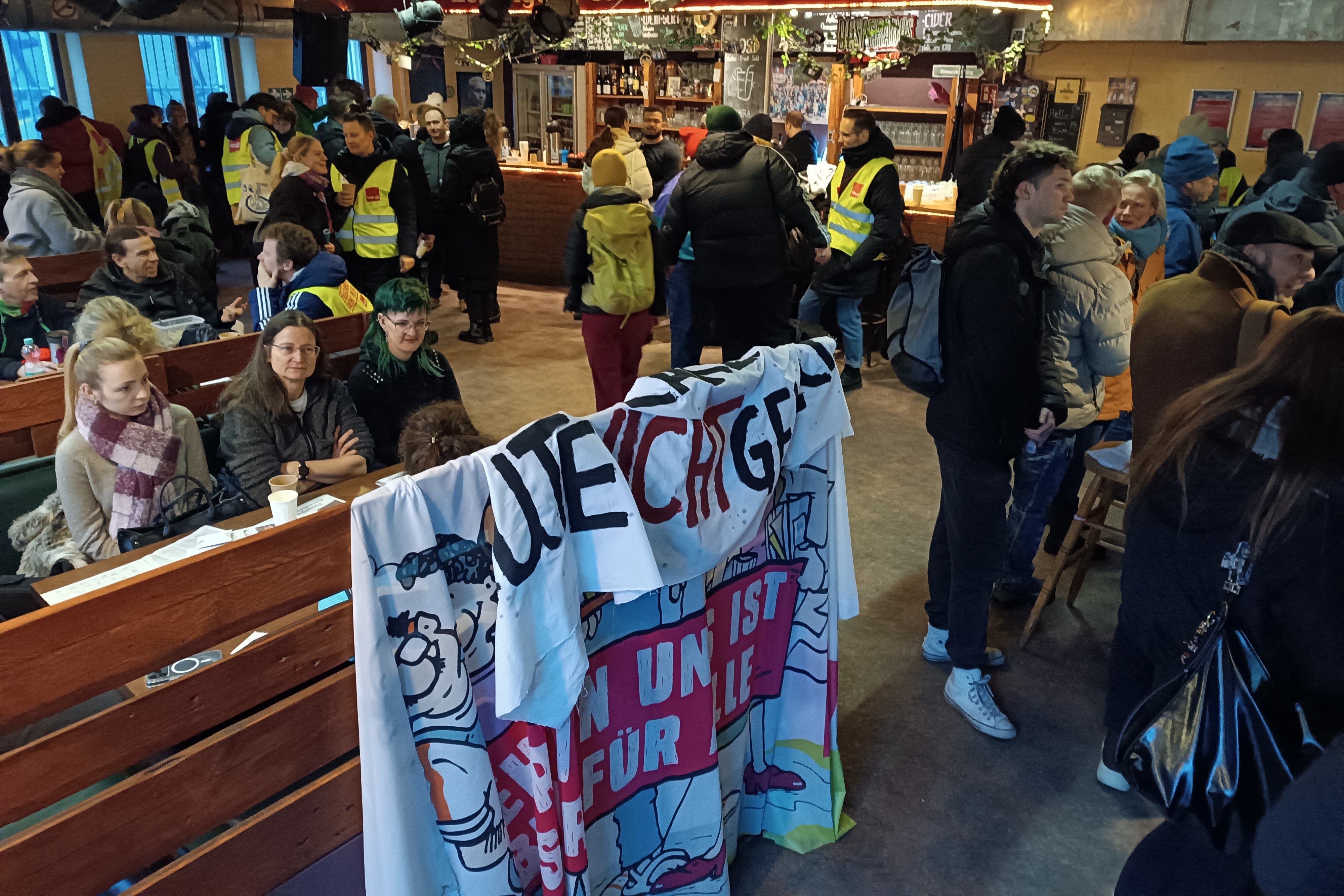 Am Dienstag, dem 10. Februar war das Streiklokal im STUK, NĂĽrnberger StraĂźe ab 05.00 Uhr besetzt, die Streikenden trafen sich, trugen sich in die Streiklisten ein und es gab fĂĽr uns die Gelegenheit, mit einigen Teilnehmenden zu sprechen.