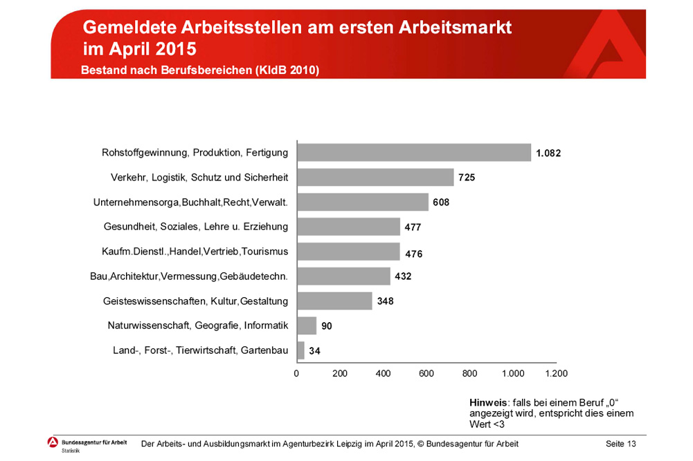 Von den knapp 4.300 gemeldeten freien Stellen entfallen allein 1.968 auf Angebote von Zeitarbeitsfirmen, die sich in Leipzig für viele Beschäftigte tatsächlich zur eigentlichen Brücke in die Unternehmen entwickelt haben. 778 Stellen gehörten in den Bereich wirtschaftliche Dienstleistungen, 225 ins Gesundheits- und Sozialwesen. Selbst das Gastgewerbe sucht (saisonbedingt) mehr Arbeitskräfte (207) als das Verarbeitende Gewerbe (136).