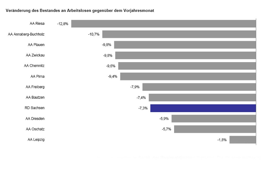 Veränderung der Arbeitslosenquoten in den sächsischen Arbeitsagenturen. Grafik: Arbeitsagentur Sachsen