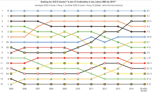 Damals war es eine Studie der Privatbank Berenberg und das Hamburgische Weltwirtschaftsinstitut (HWWI) zu Leipzig im Ranking mit München und Berlin, heute ist es eben mal Hartz-IV-Quoten in deutschen Großstädten.