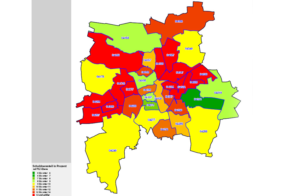 Oder mit den Worten von Creditreform: “Im Leipziger Stadtgebiet zeigen sich deutliche Spreizungen der Überschuldungssituation. Die Schuldnerampel steht im Osten und Westen der Stadt weiter auf dunkelrot. Trotz eines minimalen Anstieges (+ 0,02 Prozentpunkte) bleibt in Volkmarsdorf und Neuschönefeld die Schuldnerquote von 26,59 Prozent überdurchschnittlich hoch. Dahinter folgt mit einem Wert von 22,18 Prozent Lindenau, obwohl hier der stärkste Rückgang (- 1,1 Prozentpunkte) im gesamten Raum Leipzig verzeichnet wurde. Am geringsten fällt, wie im Vorjahr, die Überschuldung von privaten Verbrauchern in Mölkau und Baalsdorf aus. Hier liegt die Schuldnerquote nach einem leichten Anstieg (+ 0,02 Prozentpunkten) bei 5,79 Prozent.”
