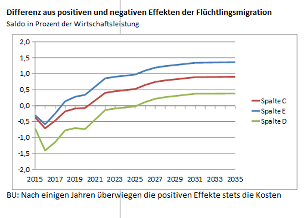 Aber das ist nicht der Hauptfehler. Und da reicht schon der Vergleich mit der Rechnung eines anderen Wirtschaftsinstituts, wo man einfach mal ein bisschen weiter gedacht hat. Das ist das Deutsche Institut für Wirtschaftsforschung (DIW) in Berlin. Das hat sich im November 2015 mal hingesetzt und ausgerechnet, was denn nun die Flüchtlinge eigentlich für das Bruttoinlandsprodukt (BIP) bedeuten. Denn Asylsuchende, die Arbeit finden, tragen ja wieder zum BIP bei, entlasten also nicht nur die Sozialkassen. Ein Punkt, an dem das IW Köln eindeutig nur die halbe Rechnung gemacht hat.