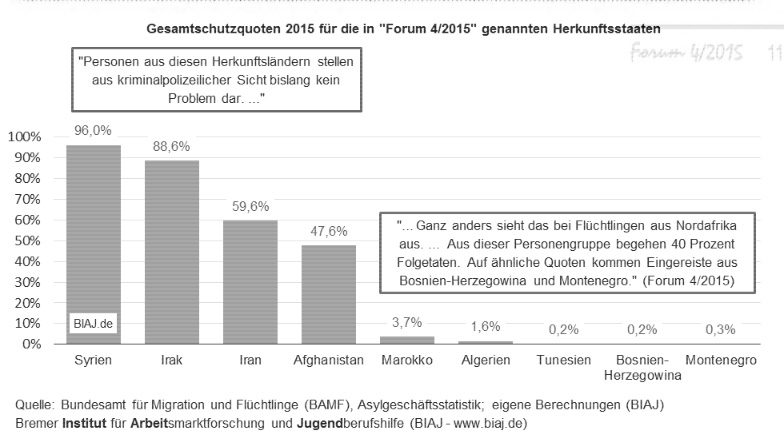 „Eine hier nicht beantwortete Frage: Was hätten zum Beispiel die Journalisten von ‚Stern Investigativ‘ geschrieben und die Journalisten von ‚Die Welt‘ daraus gemacht, wenn unter dem Artikel in ‚Forum 4/2015‘ eine Abbildung mit den ‚Gesamtschutzquoten‘ für die im Artikel genannten Herkunftsstaaten veröffentlicht worden wäre?“
