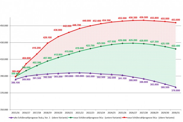 Das hat versucht, den Trend in zwei Varianten zu erfassen: In einer Minimalvariante (untere Variante), die von einer moderaten Zuwanderung ausgeht, steigt die Zahl der Schüler im nächsten Schuljahr auf rund 396.600. Das sind 6.700 Schüler mehr als das Statistische Landesamt im Jahr 2010 noch vorausberechnet hatte. Bis zum Schuljahr 2019/2020 steigt die Schülerzahl auf 412.000. Die ältere Prognose ging noch von 393.200 Schülern aus. Damit werden im Schuljahr 2019/2020 bis zu rund 18.800 Schüler mehr erwartet als bisher angenommen.