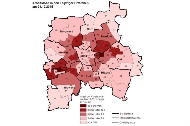 Was all jenen nicht hilft, die sowieso schon Handicaps bei der Vermittlung haben. Zu diesen Handicaps gehört auch die Welt, in der sie leben. Das wird deutlich, wenn Kreymann die Quoten der Langzeitarbeitslosen auf Ortsteilebene berechnet und in Grünau-Ost auf 42,1 Prozent kommt. Bei den SGB-II-Quoten sieht es ganz ähnlich aus, denn dann sind ja meist nicht nur die „Ernährer der Familie“ betroffen (findet man mal einen Job, der eine ganze Familie ernährt), sondern die ganze Familie. Und jetzt kommt es eher auf die Interpretation an: Landen die Betroffenen in bestimmten Stadtteilen, weil dort die Mieten so schön billig waren? Oder sorgt das Klima in einem sozial durchwachsenen Stadtgebiet dafür, dass Menschen in ihren Problemschleifen stecken bleiben?