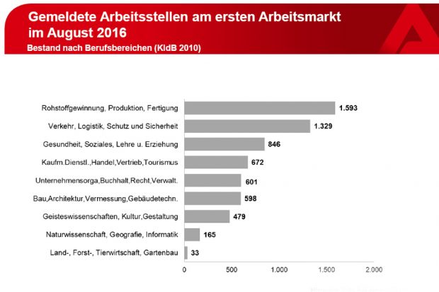 Nach Branchen geordnet sieht die Nachfrage ganz anders aus: 1.593 Arbeitnehmer wurden im Bereich Rohstoffgewinnung, Produktion, Fertigung gesucht, 1.329 im Bereich Verkehr, Logistik, Schutz und Sicherheit, 846 im Bereich Gesundheit, Soziales, Lehre und Erziehung. Nichts da mit Leiharbeit oder Handel. Der Handel kommt – zusammen mit Vertrieb und Tourismus – erst auf Platz 4.